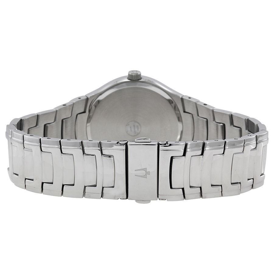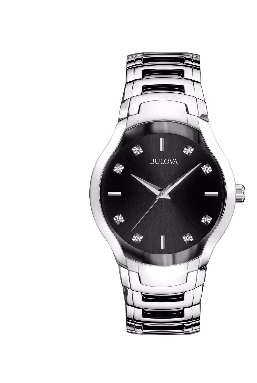From the Bulova Diamonds Collection. In stainless steel with 8 diamonds individually hand-set on a patterned black dial, domed metallized crystal, second hand, and double-press fold-over clasp. Case size: 39 mm. Water resistant to 30 meters / 99 feet.