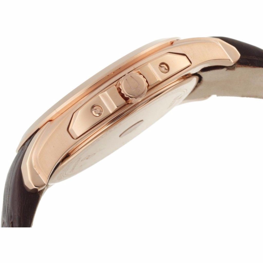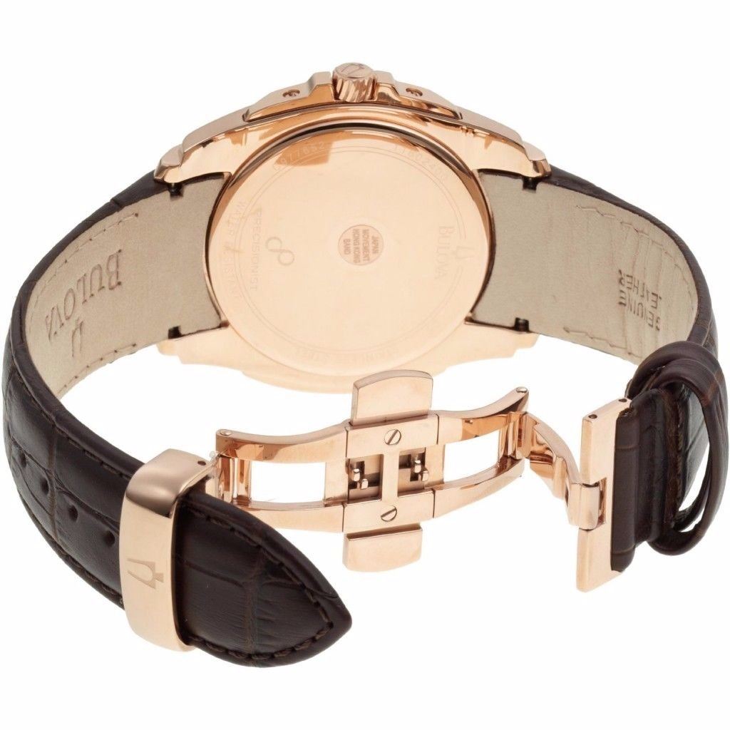 From the Precisionist Collection. Featuring Bulova?s proprietary Precisionist quartz accuracy, in stainless steel with rose-gold finish, domed metalized crystal, multiple-layer brown and rose-gold dial, luminous hands, calendar, padded and stitched dark brown leather strap, double-press deployant closure and water resistance to 30 meters