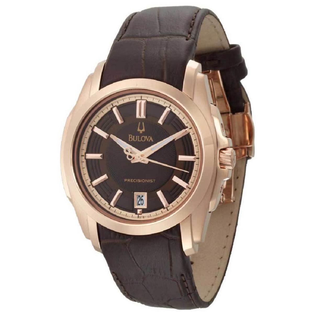 From the Precisionist Collection. Featuring Bulova?s proprietary Precisionist quartz accuracy, in stainless steel with rose-gold finish, domed metalized crystal, multiple-layer brown and rose-gold dial, luminous hands, calendar, padded and stitched dark brown leather strap, double-press deployant closure and water resistance to 30 meters
