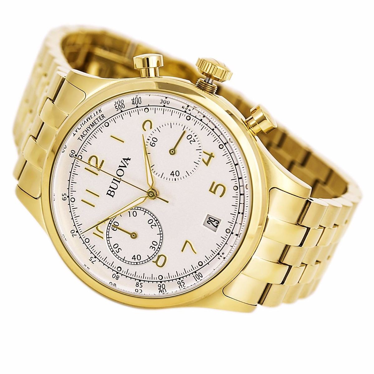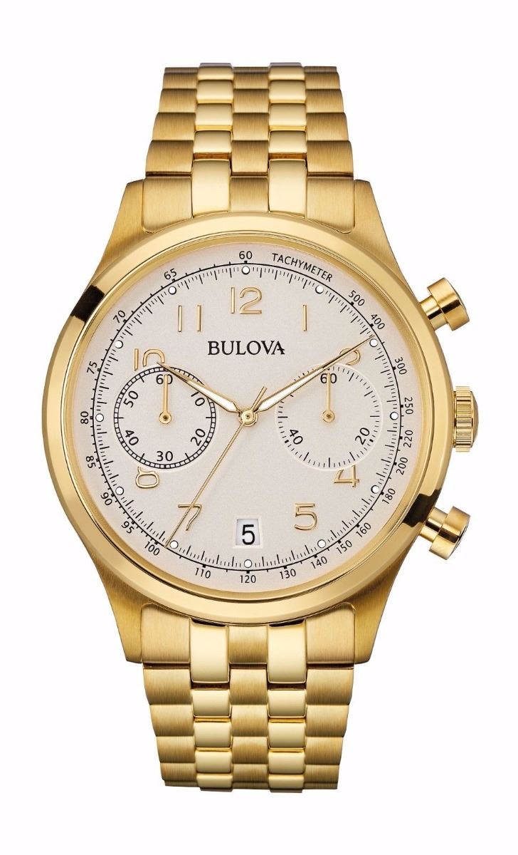 Distinguished by a light gray chronograph dial set in a 43mm yellow-gold-tone stainless steel case, this men's watch from the Classic collection by Bulova was designed to make an impression. A date window and tachymeter scale complete the dial, which is topped by a curved mineral crystal. The men's watch features a quartz chronograph movement, and it is water-resistant to 30 meters. The yellow-gold-tone stainless steel bracelet secures with a push-button deployment clasp.