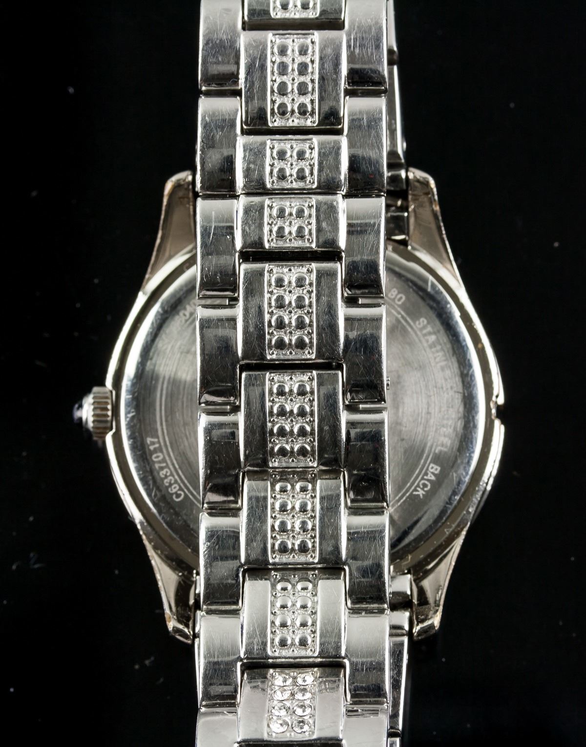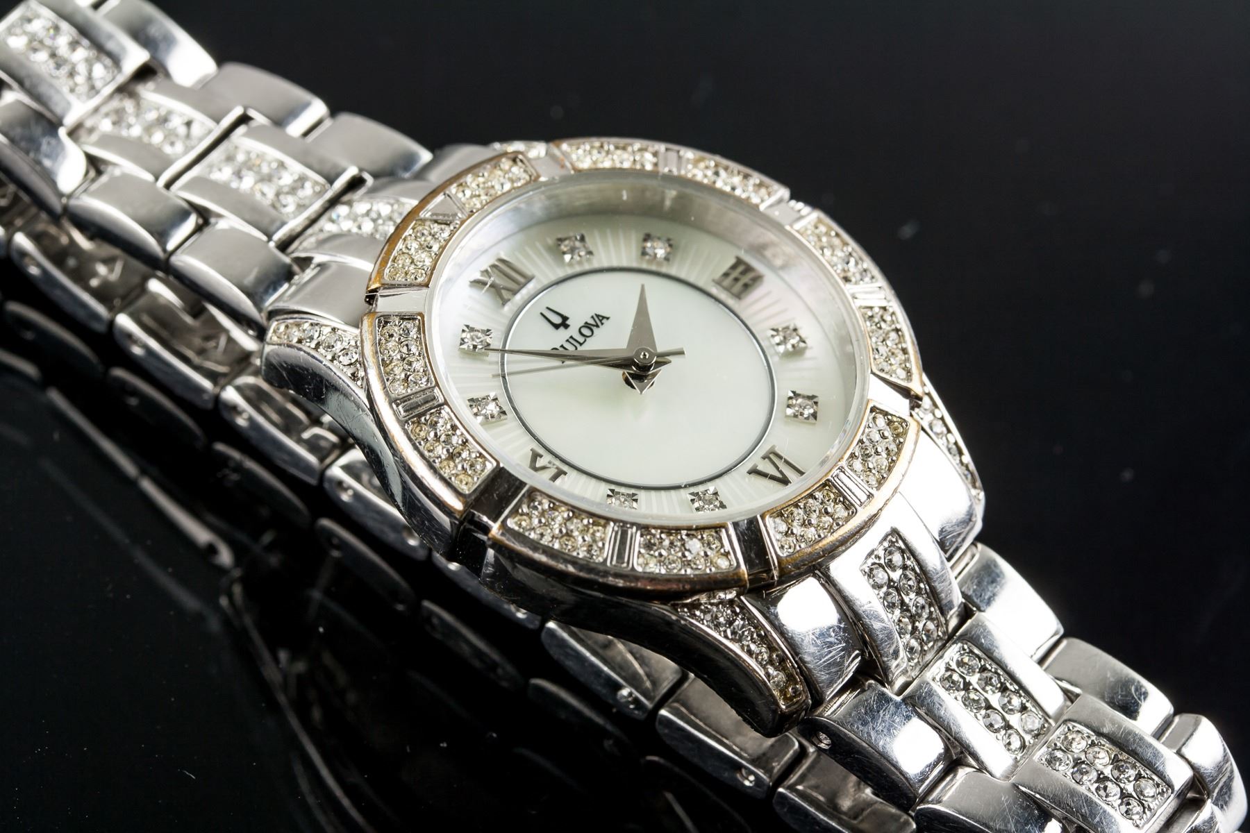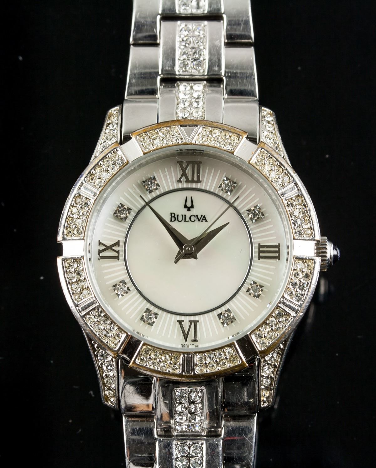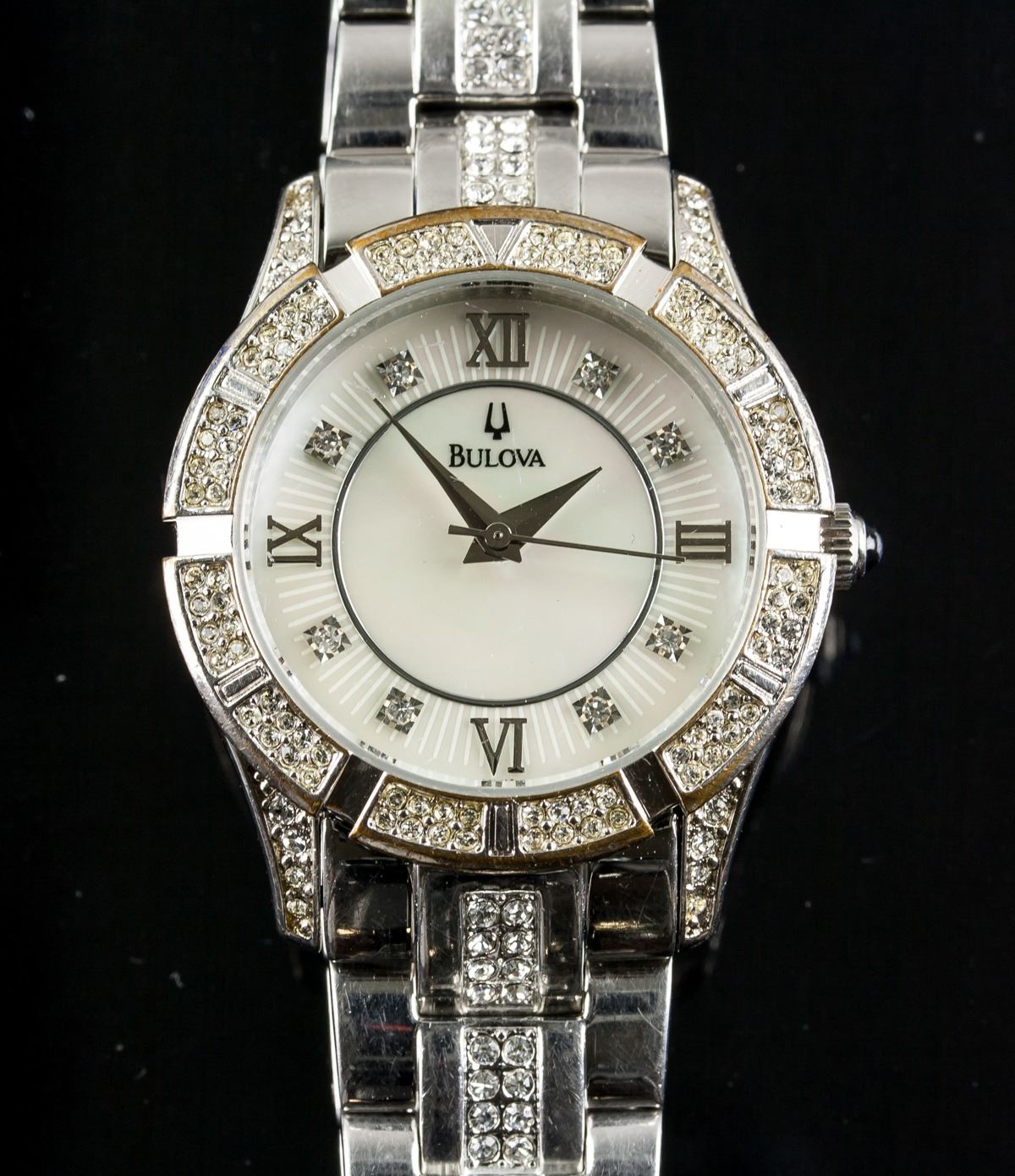 Bulova crystal mother of pearl dial; crystal accent; needs repair; stainless steel back and band; water resistant; C6337017; retail value $400.