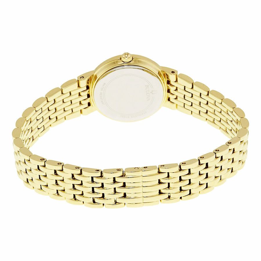 Yellow gold-tone stainless steel case and bracelet. Fixed yellow gold-tone diamond-accented bezel. Gold sunray dial with luminous gold-tone hands and diamond hour markers. A Roman numeral appears at the 12 o'clock position. Minute markers around the outer rim. Dial Type: Analog. Luminescent hands. Quartz movement. Scratch resistant mineral crystal. Solid case back. Case size: 26 mm. Case thickness: 6.8 mm. Round case shape. Band width: 14 mm. Deployment clasp. Water resistant at 30 meters / 100 feet. Functions: hour, minute, second. Additional Info: in general, withstands splashes or brief immersion in water, but not suitable for swimming or bathing. Dress watch style. Bulova Gold Dial Diamond Ladies Watch