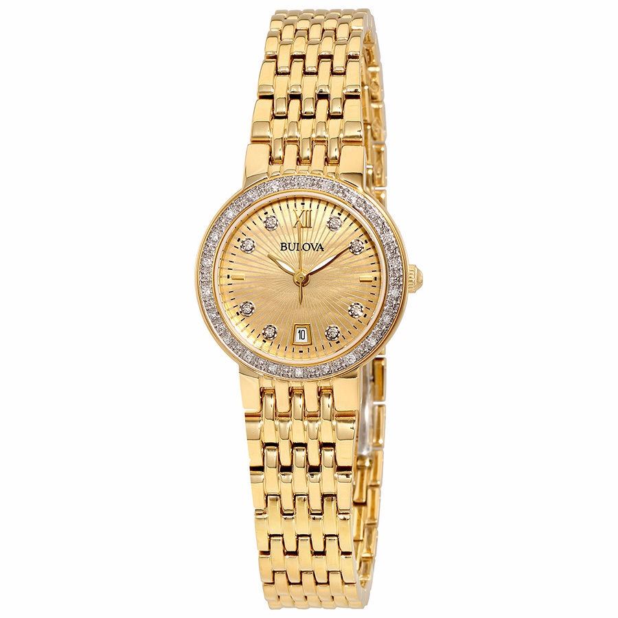 Yellow gold-tone stainless steel case and bracelet. Fixed yellow gold-tone diamond-accented bezel. Gold sunray dial with luminous gold-tone hands and diamond hour markers. A Roman numeral appears at the 12 o'clock position. Minute markers around the outer rim. Dial Type: Analog. Luminescent hands. Quartz movement. Scratch resistant mineral crystal. Solid case back. Case size: 26 mm. Case thickness: 6.8 mm. Round case shape. Band width: 14 mm. Deployment clasp. Water resistant at 30 meters / 100 feet. Functions: hour, minute, second. Additional Info: in general, withstands splashes or brief immersion in water, but not suitable for swimming or bathing. Dress watch style. Bulova Gold Dial Diamond Ladies Watch