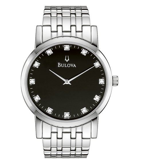 Dial features 12 genuine diamonds! A REAL STUNNER An unbelievable watch that will last a lifetime and be a statement to your good taste...what else can you expect from Bulova. This is an impressive watch with those 12 bright diamonds on the dial. 12 Sparkling Genuine Diamonds as Hour Markers Stainless Steel case and bracelet Stunning Black Dial Silver hands Water Resistant to 100m Mineral crystal, tough to resist scratches Quartz Movement for accuracy Fold-over type clasp for security Case diameter: approx 1 1/2", (38mm)