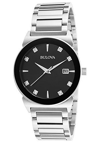 This Bulova watch is fashionable and fashion-forward, and will take him/her easily from the boardroom to a night out. The luminous silver-tone hands and bold black dial with date display and diamond markers are a handsome contrast. Ensuring accurate time keeping, the Japanese quartz movement keeps you right on time. Water-resistant up to 30 meters and securing with a stainless steel link bracelet with deployment clasp.