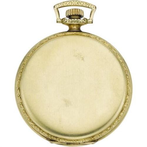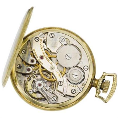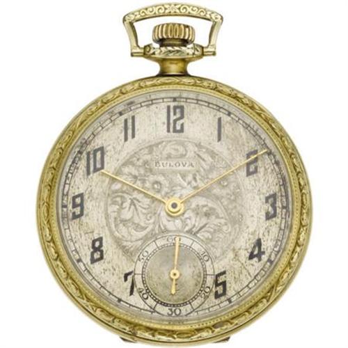 <B>Bulova Gold-Filled Openface Pocket Watch</B></I><BR><BR>Case: 44 mm, circular, hinged 14k yellow gold-filled with decorative wallpaper panel texture and smooth edge, reference #4343829, marked Elgin Giant Wath Case Co.<BR>Dial: goldtoned with ornately decorated center panel, having black numerals, goldtoned hour and minute markers, together with sunken auxiliary dial with sweep seconds, signed Bulova<BR>Movement: 38 mm, 15 jewels, manual wind, No. 51455, marked Bulova Watch Co. 17AA<BR>Signed: double signed Bulova on movement and dial, signed Elgin on case <B>Condition Report:</B> Good condition.<BR><BR><b>Shipping:</b> Miscellaneous Collectibles, Smal (<a target="_blank" href="http://www.heritageauctions.com/common/shipping.php">view shipping information</a>)