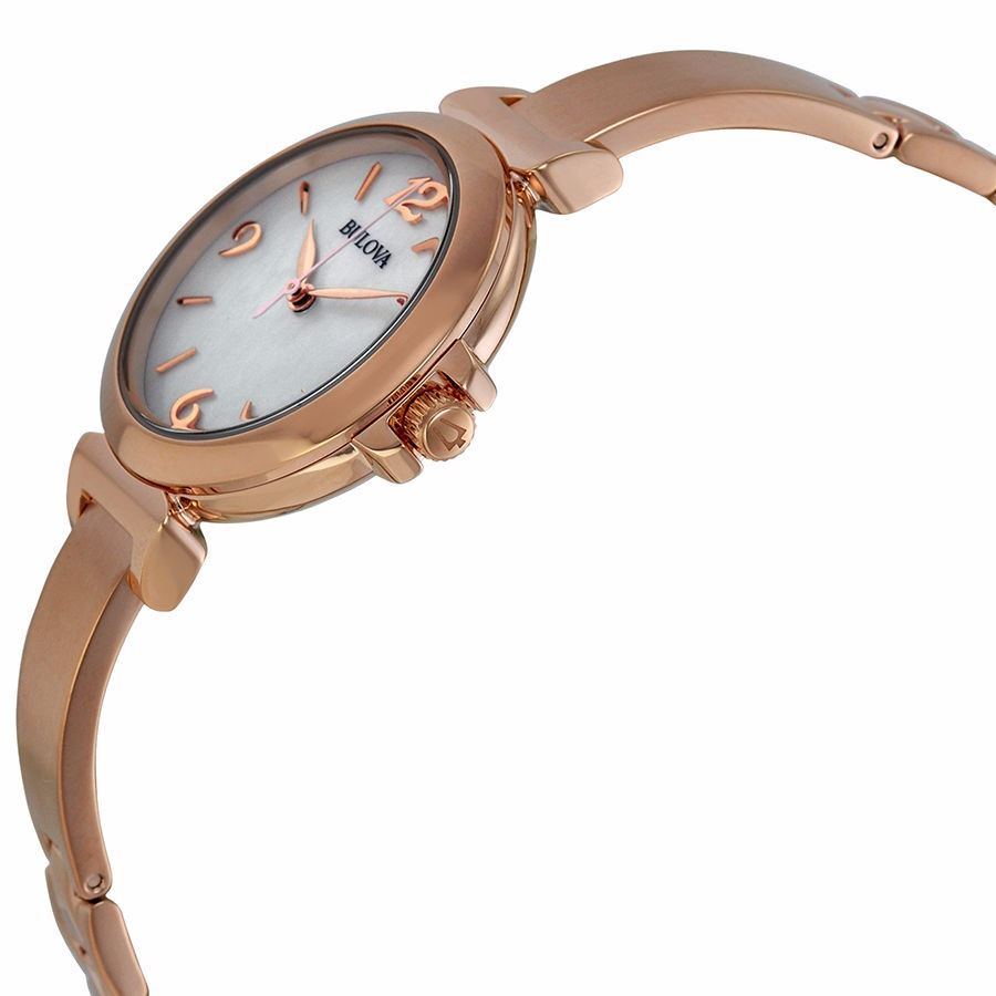 Rose gold-tone stainless steel case and bracelet. Fixed rose gold-tone bezel. Mother of pearl dial with rose gold-tone hands and index hour markers. Arabic numerals mark the 3, 6, 9 and 12 o'clock position