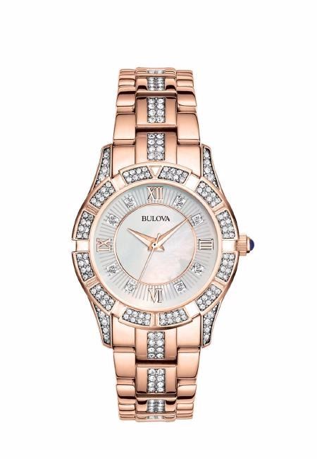 From the Crystal Collection. In stainless steel with rose-gold finish, 200 Swarovski crystals individually hand-set on case, bracelet and patterned white mother-of-pearl dial, blue cabochon crown, and deployant closure.