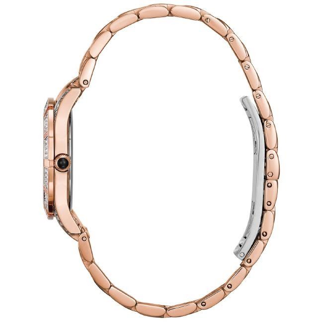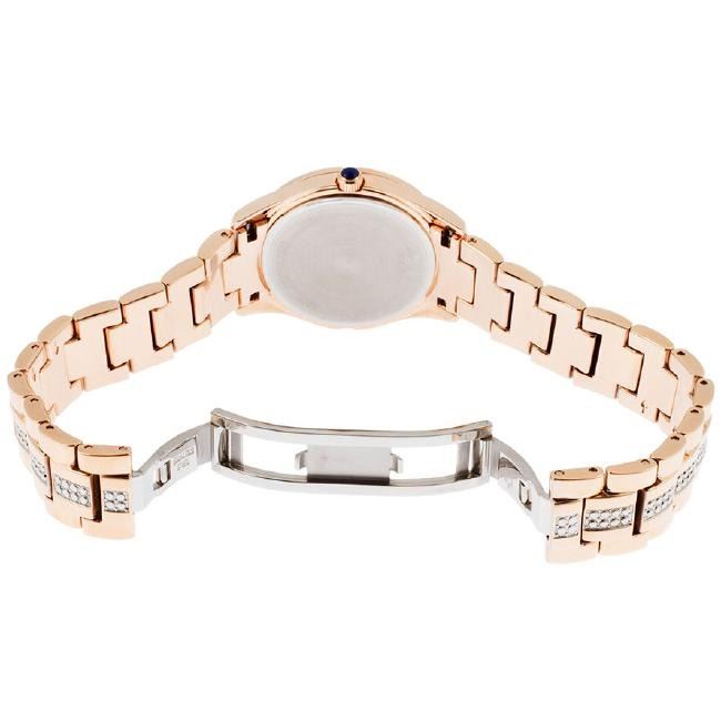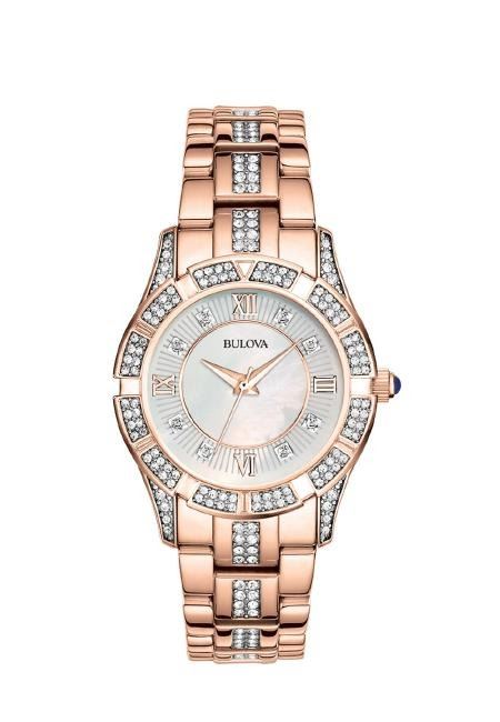 From the Crystal Collection. In stainless steel with rose-gold finish, 200 Swarovski crystals individually hand-set on case, bracelet and patterned white mother-of-pearl dial, blue cabochon crown, and deployant closure.