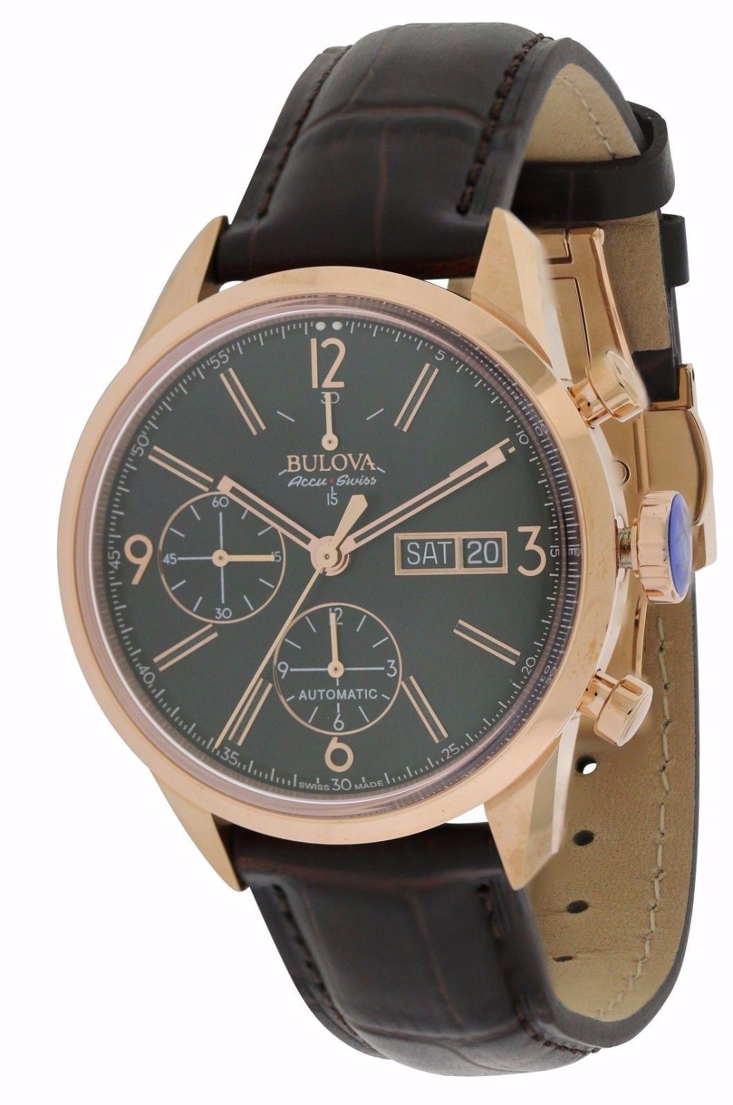 Black chronograph dial with vintage 1950s styling distinguishes this men's watch from the Murren collection by Bulova. The chronograph watch has a Swiss-made automatic movement set in a 41mm rose-gold-tone ion-plated stainless steel case topped by a double-curved, anti-reflective sapphire crystal. The dial includes a day/date window, applied markers, and luminous hands. The men's chronograph watch is water-resistant to 30 meters and has a brown leather strap secured with a push-button deployment clasp. This watch is brand new and comes with box, tags, manual and a valid three-year manufacturer's warranty from Bulova. When it comes to pre-eminent Swiss watchmaking, Bulova has been a leader in the field since 1912. The Bulova Accu-Swiss brand exemplifies the very best Swiss-made craftsmanship with precision automatic, mechanical and quartz movements, premium crafted cases and bands along with anti-reflective sapphire crystals on each and every one of their watches.