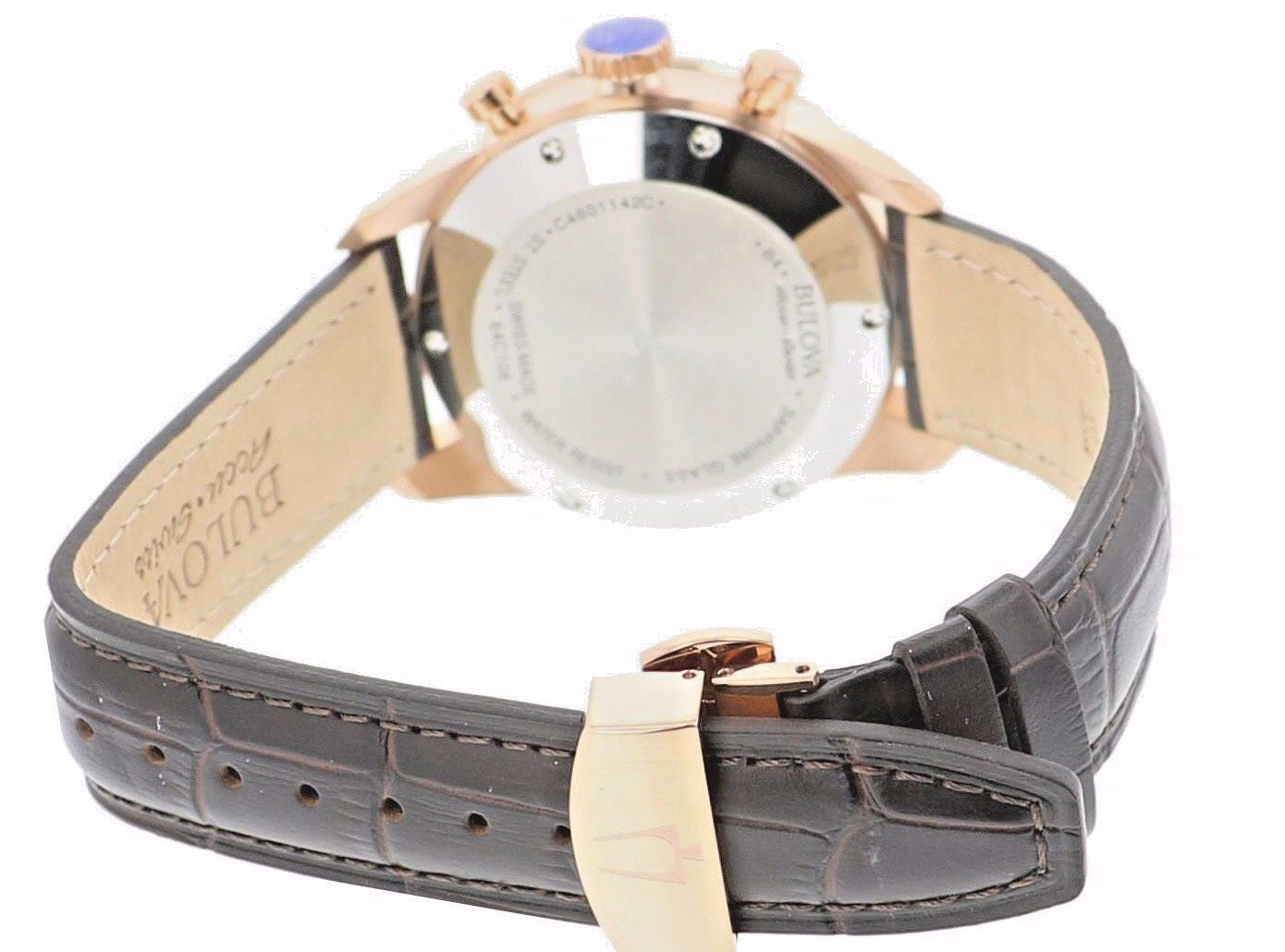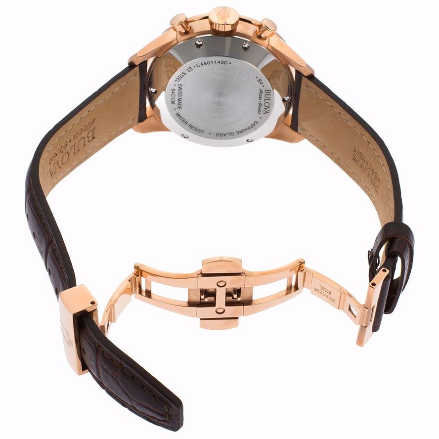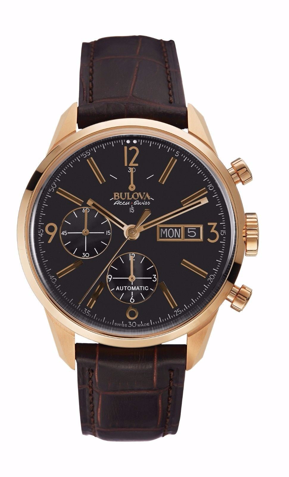 Black chronograph dial with vintage 1950s styling distinguishes this men's watch from the Murren collection by Bulova. The chronograph watch has a Swiss-made automatic movement set in a 41mm rose-gold-tone ion-plated stainless steel case topped by a double-curved, anti-reflective sapphire crystal. The dial includes a day/date window, applied markers, and luminous hands. The men's chronograph watch is water-resistant to 30 meters and has a brown leather strap secured with a push-button deployment clasp. This watch is brand new and comes with box, tags, manual and a valid three-year manufacturer's warranty from Bulova. When it comes to pre-eminent Swiss watchmaking, Bulova has been a leader in the field since 1912. The Bulova Accu-Swiss brand exemplifies the very best Swiss-made craftsmanship with precision automatic, mechanical and quartz movements, premium crafted cases and bands along with anti-reflective sapphire crystals on each and every one of their watches.