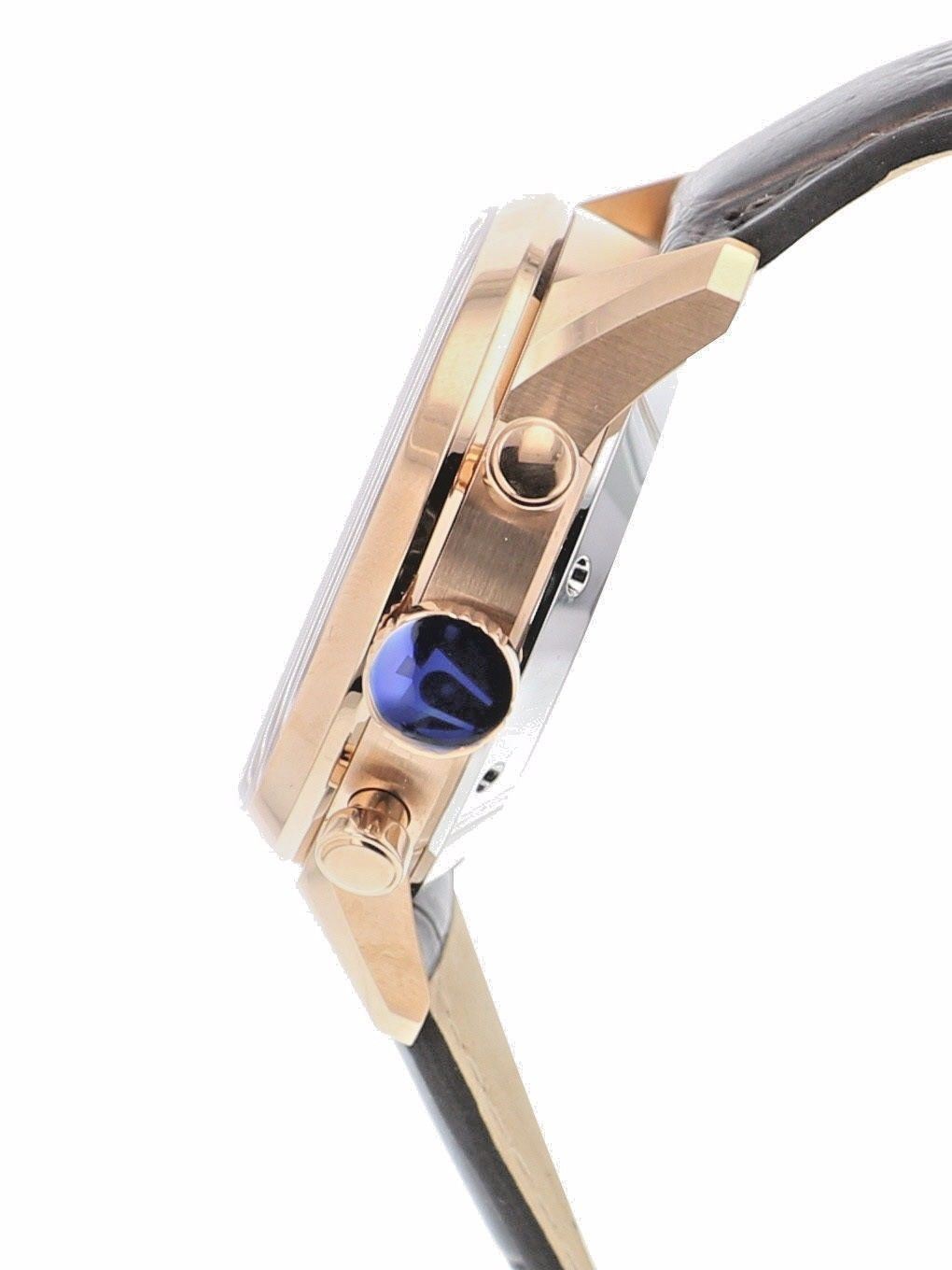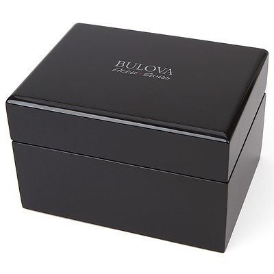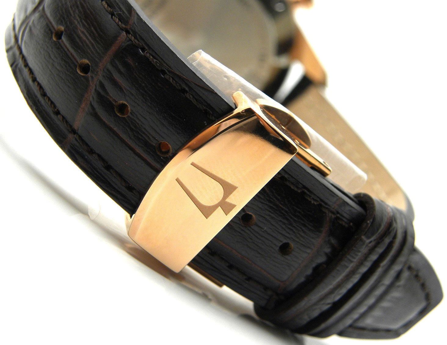 Black chronograph dial with vintage 1950s styling distinguishes this men's watch from the Murren collection by Bulova. The chronograph watch has a Swiss-made automatic movement set in a 41mm rose-gold-tone ion-plated stainless steel case topped by a double-curved, anti-reflective sapphire crystal. The dial includes a day/date window, applied markers, and luminous hands. The men's chronograph watch is water-resistant to 30 meters and has a brown leather strap secured with a push-button deployment clasp. This watch is brand new and comes with box, tags, manual and a valid three-year manufacturer's warranty from Bulova. When it comes to pre-eminent Swiss watchmaking, Bulova has been a leader in the field since 1912. The Bulova Accu-Swiss brand exemplifies the very best Swiss-made craftsmanship with precision automatic, mechanical and quartz movements, premium crafted cases and bands along with anti-reflective sapphire crystals on each and every one of their watches.