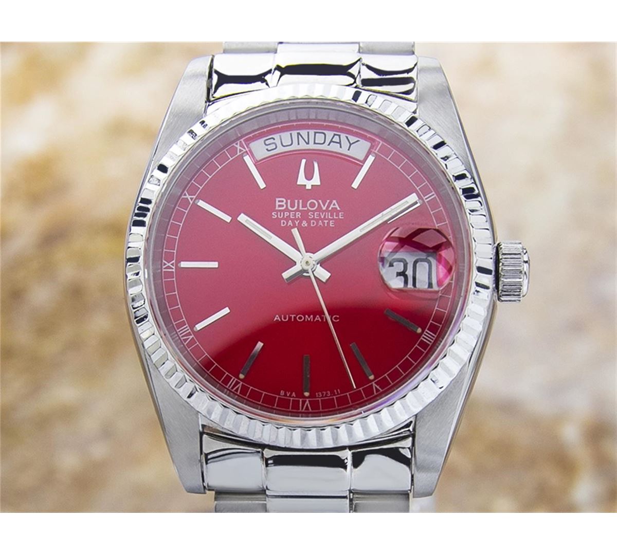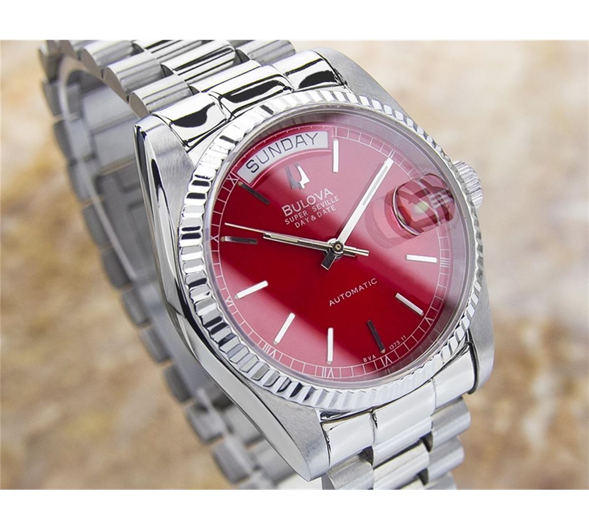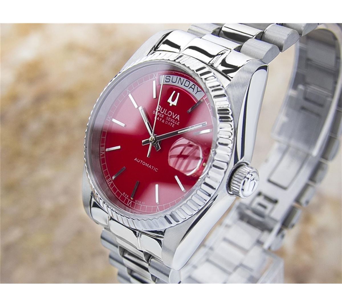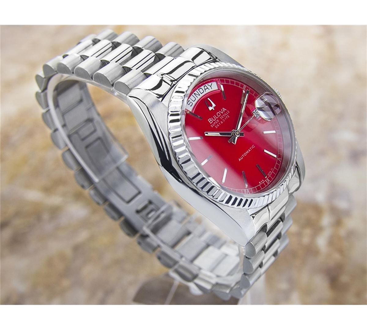 Bulova Super Seville Day Date Stainless Steel Automatic Watch. Brand: BULOVA. Model: SUPER SEVILLE. Movement: Automatic. Case Material: Stainless Steel. Crystal: SAPPHIRE. Case Size: 44X36. Band: ORIGINAL Stainless Steel BRACELET.