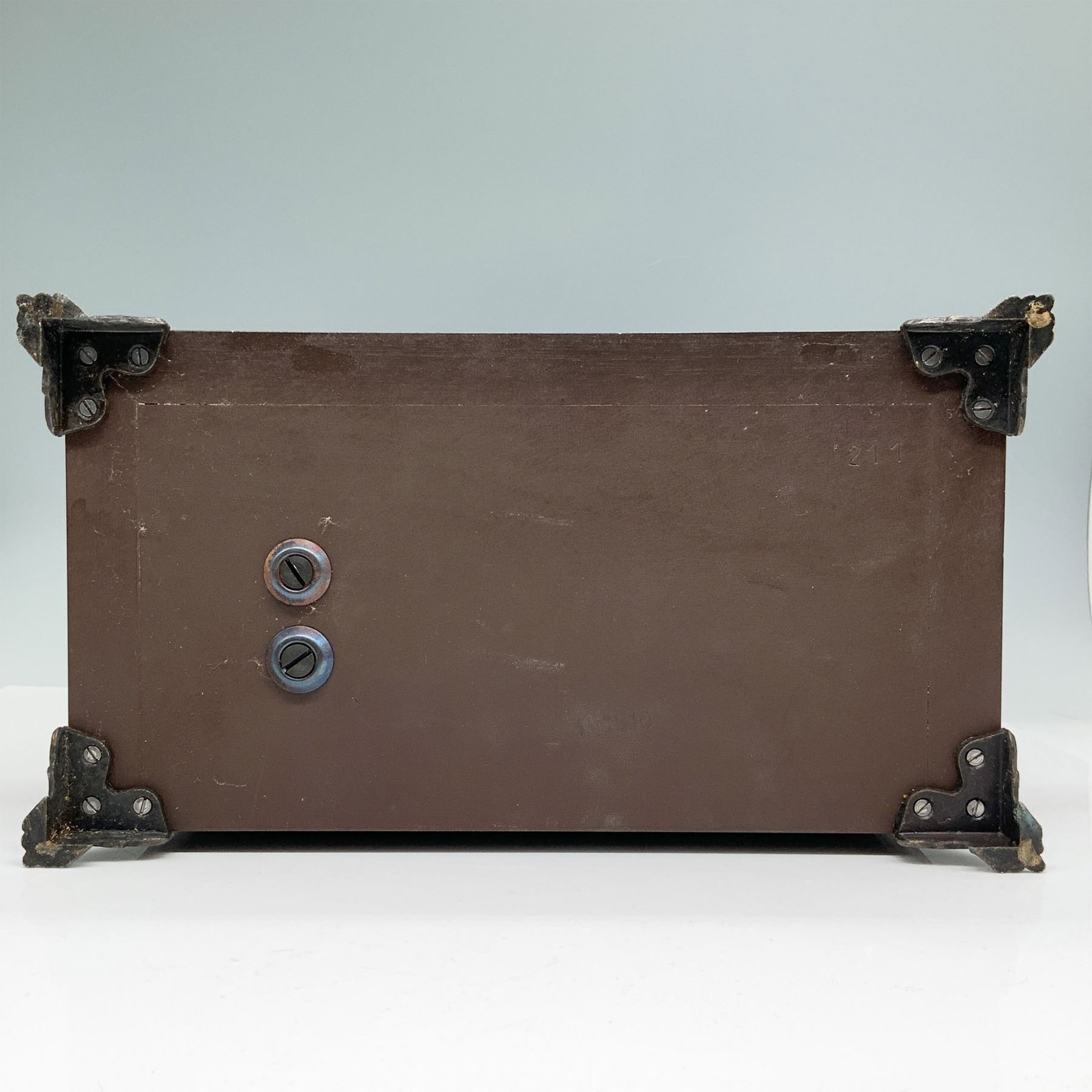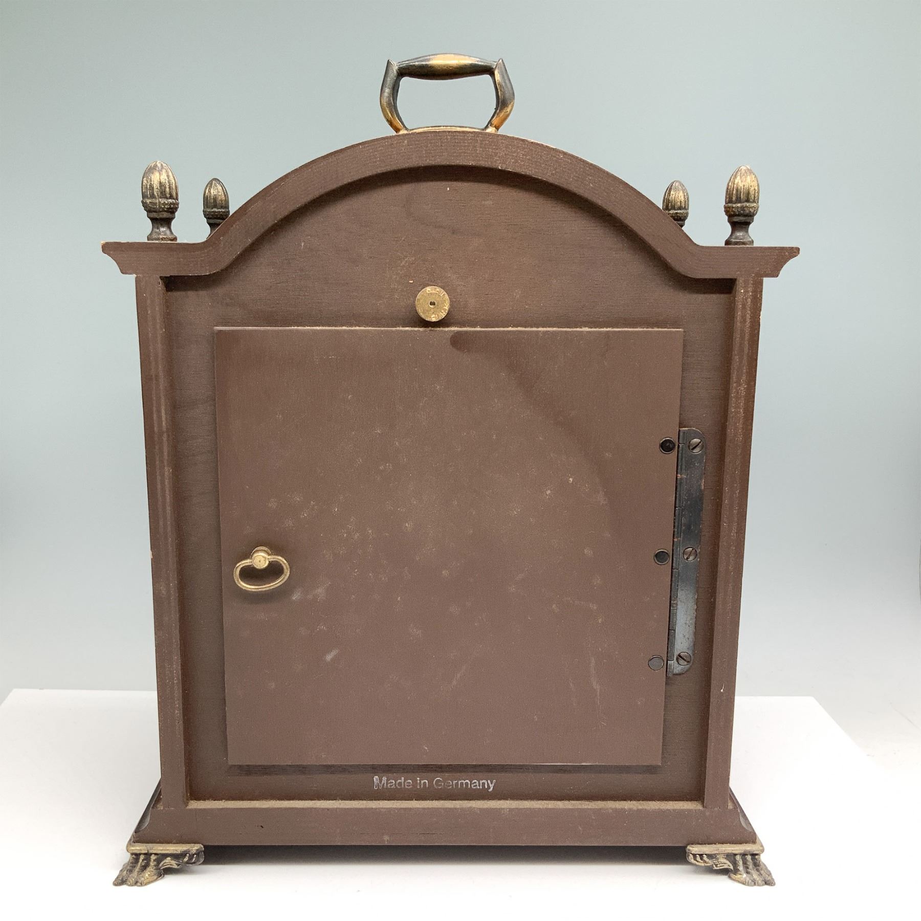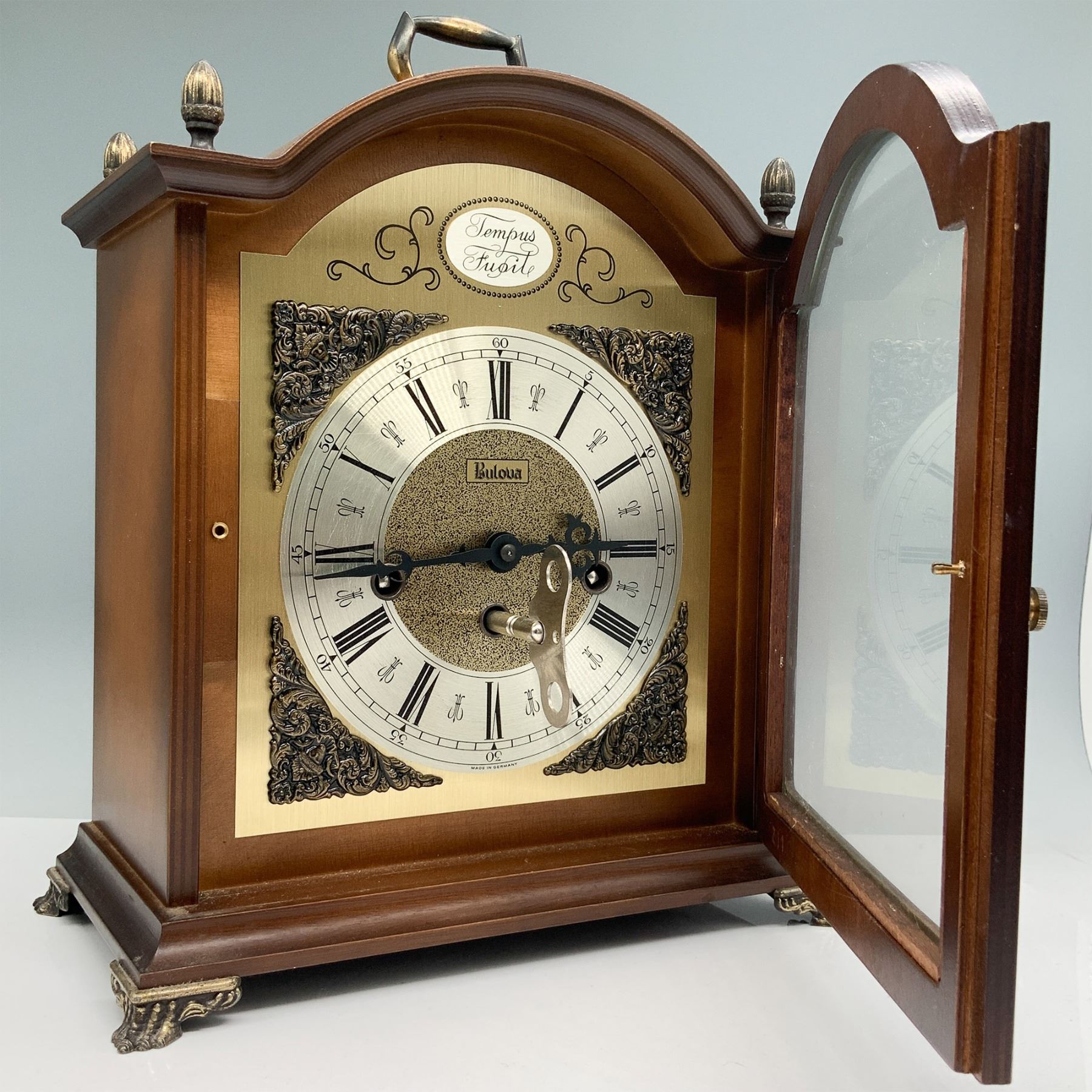 Vintage Bulova Tempus Fugit mantel clock featuring a finely crafted wooden case with decorative brass-tone accents. The clock face showcases Roman numerals, ornate metal corner embellishments, and a detailed brass dial with the Tempus Fugit inscription. It is fitted with a hinged glass door, brass handle, and finials, enhancing its classic appeal. The clock includes a key for its key-wound movement mechanism. The back panel is marked Made in Germany, indicating its quality craftsmanship. A distinguished timepiece ideal for collectors or home decor.