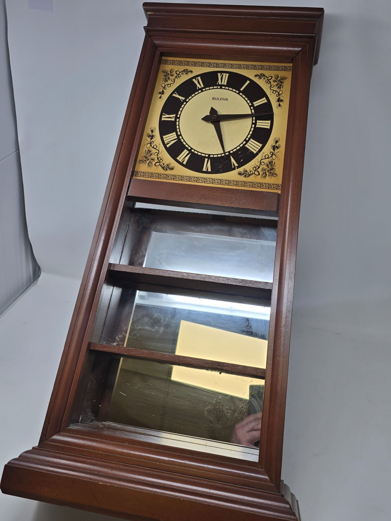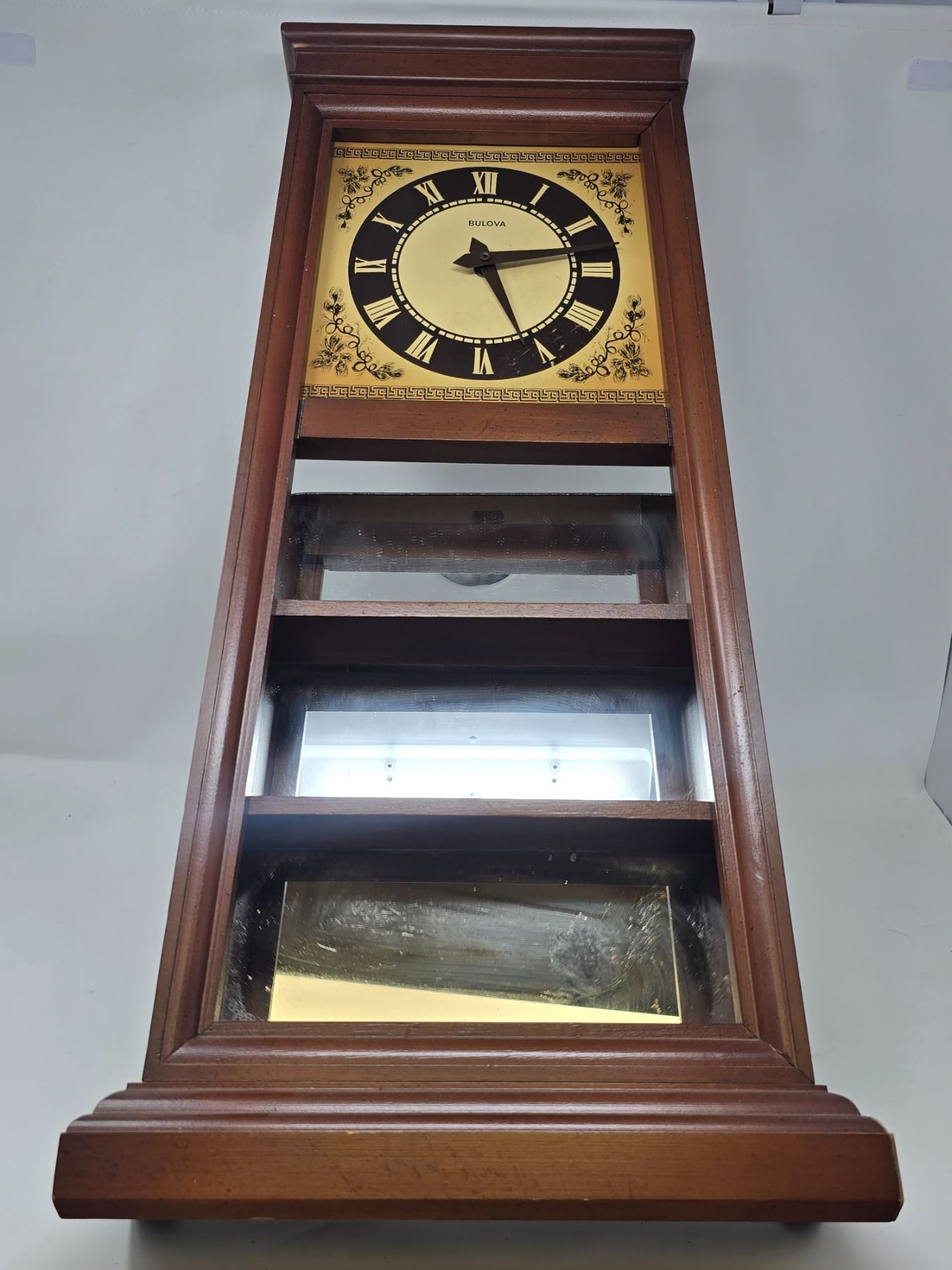 Elegant wall-mounted Bulova clock with a golden face, Roman numerals, and mirrored lower panel. Classic design with dark wood frame—perfect for vintage decor enthusiasts.