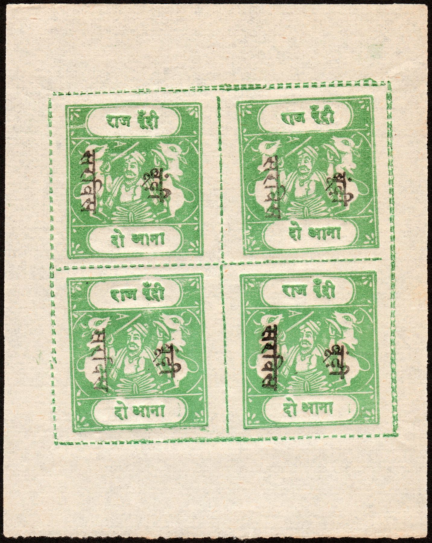 Indian States, Bundi, 1914-1941, 2 Annas, block of 4, image of the Raja protecting the sacred cows, SG # O1b bb, MNH, good condition, Rare.