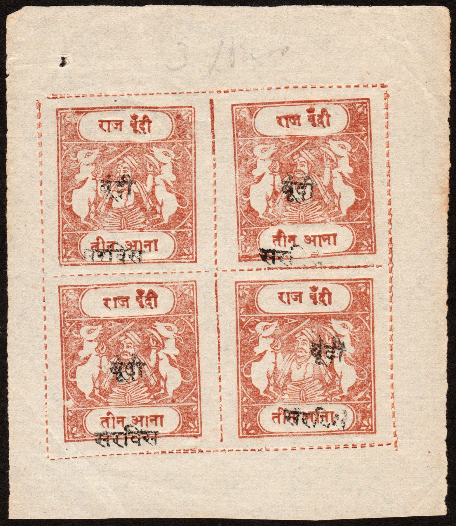 Indian States, Bundi, Error print, 1914-1941, 3 Annas, block of 4, image of the Raja protecting the sacred cows, SG # O3a, MNH, good condition, Rare.