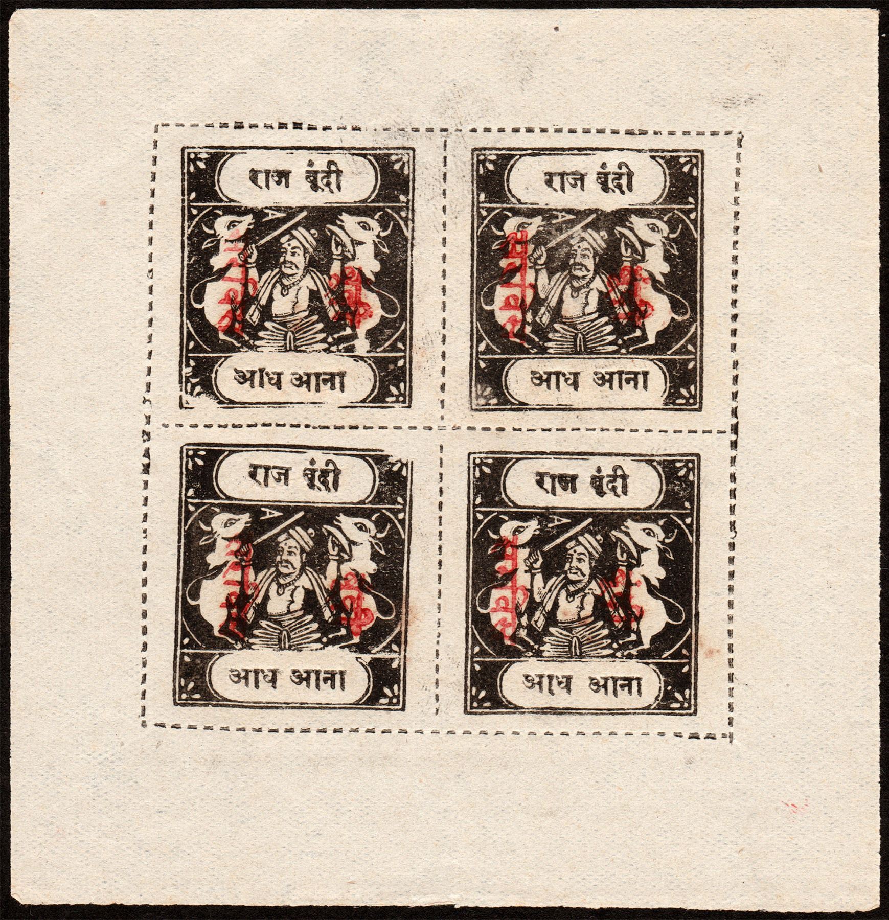 Indian States, Bundi, 1914-1941, ½ Anna, block of 4, image of the Raja protecting the sacred cows, SG # O7aa, MNH, good condition, Very Rare.