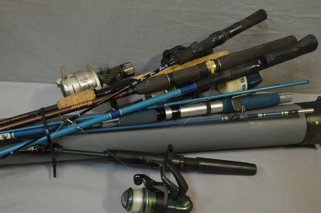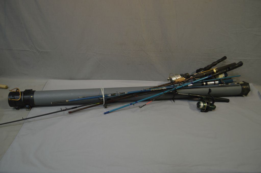 Bundle Lot : Approx. Six Plus Fishing Rods, w/ approx. five reels, one Phantom Plano plastic fishing rod tube ONLY