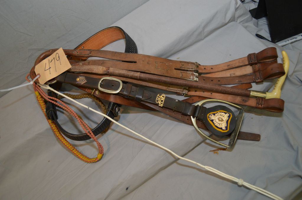 Bundle Lot : RCMP Ant Leather Riding Stirrup w/ Badges, etc - Ant Riding Quirt w/fancy handle - Two Vint Leather Broad Arrow Mkd Straps w/rounded leather covered ends - Two leather straps - Lg Heavy Black Leather Belt - Three Various Lanyards [ white, olive green, red & gold ]