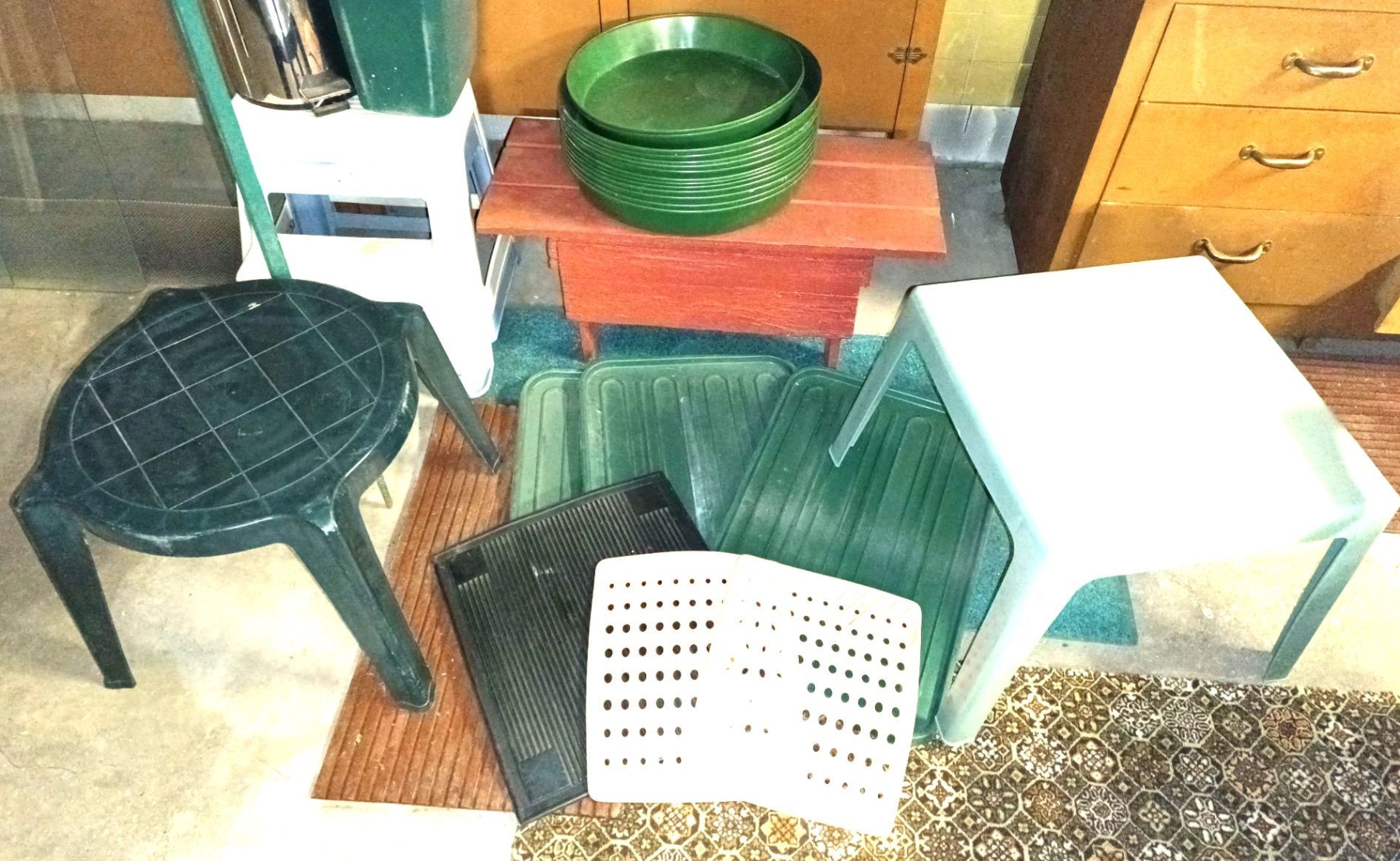 Bundle Of Rubbermaid Mats, Stools, Wood Bench, Garbage Cans & More