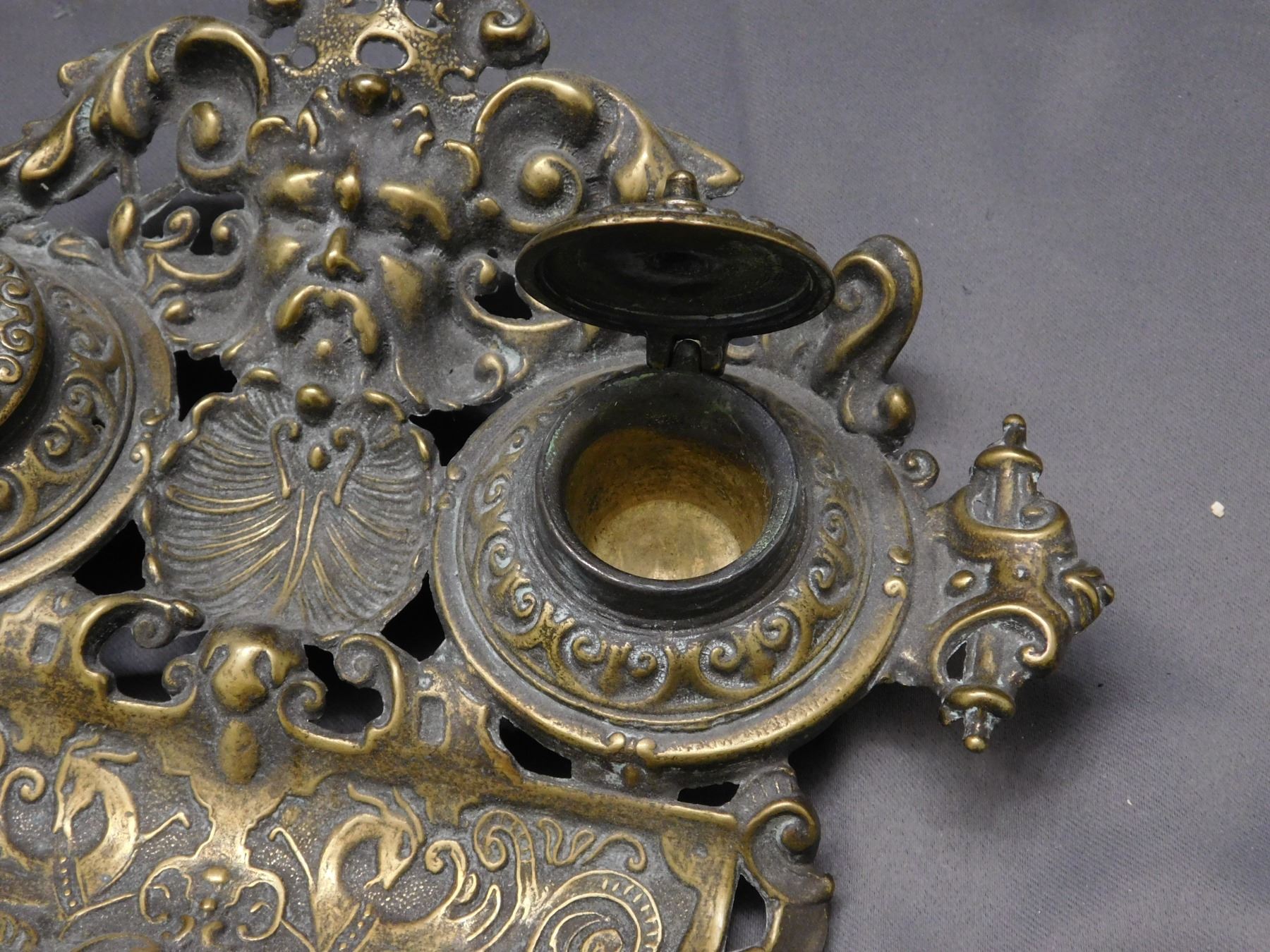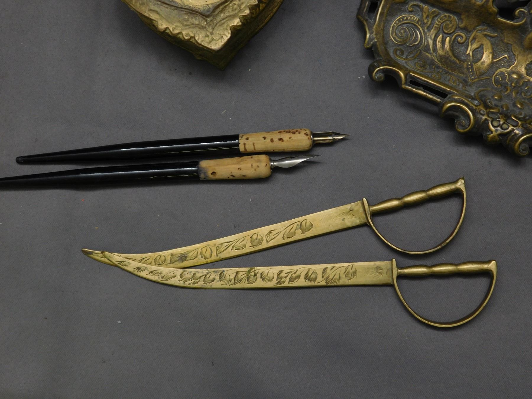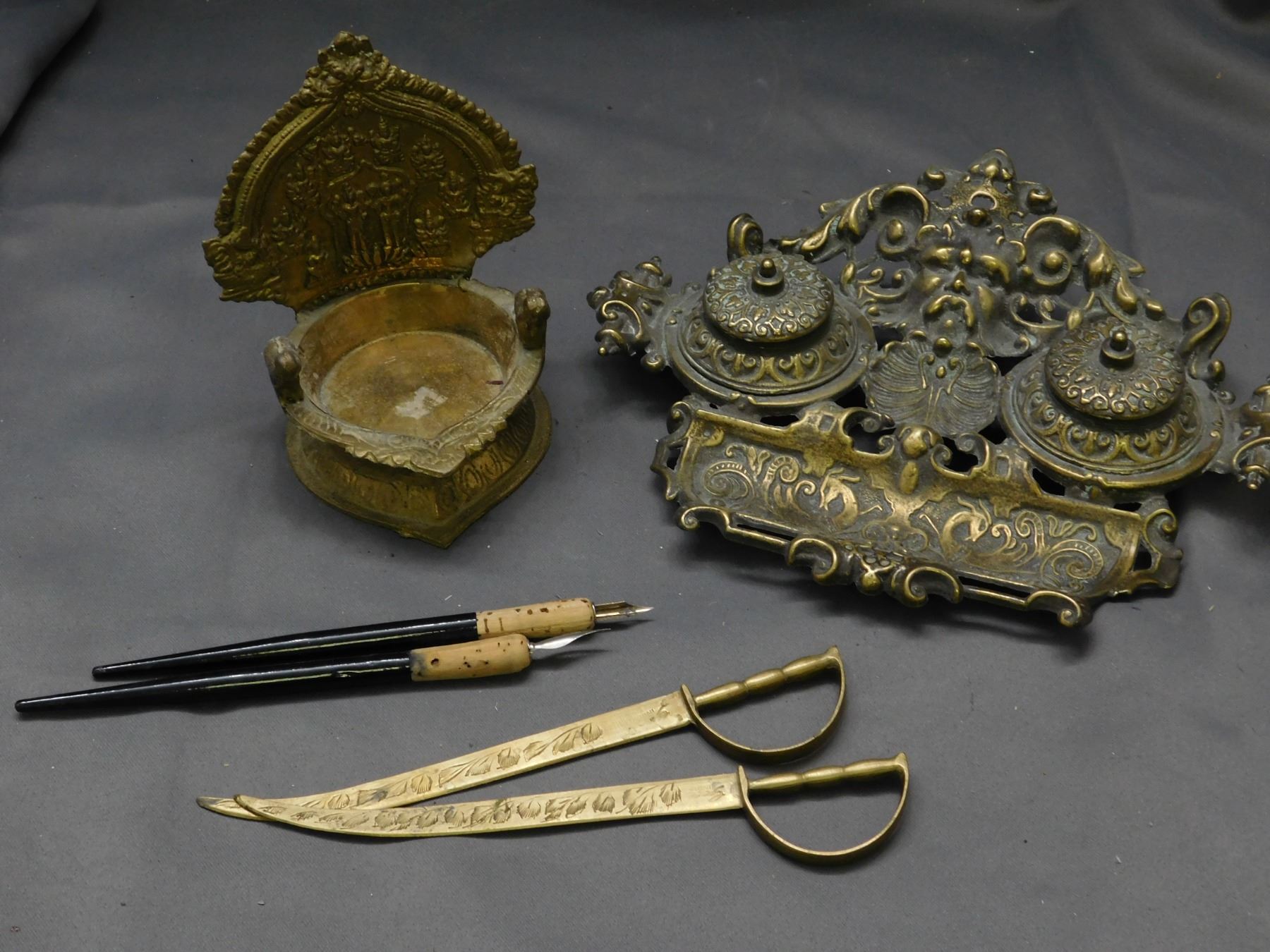 Bundle of Desk Accessories Ink Pens, Ink Well & Pen Rest, Dish, Letter Openers Brass / Asian Style