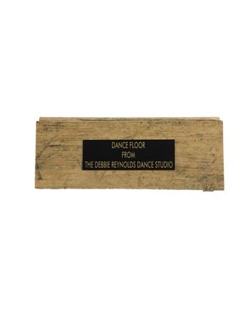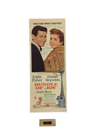 Bundle of Joy (RKO Radio Pictures, 1956). Insert. Starring Debbie Reynolds and Eddie Fisher. Autographed by Debbie Reynolds. There are creases and edge wear damage. Fine. (14" x 36"). Paired with a piece of the original, wooden dance floor from Debbie Reynolds Dance Studio, with a custom engraved "Debbie Reynolds Dance Studio" plate (3.5"x 6.25"). This amazing memorabilia comes direct from the Debbie Reynold's archive collection. The Debbie Reynold's archive collection was formed by Debbie Reynolds and her son Todd Fisher who collected and preserved some of the best of Hollywood's costumes and props. Beginning their collection decades ago by purchasing collections from the MGM auction, 20th Century Props auctions, Christie's auctions, Planet Hollywood and numerous additional auctions.