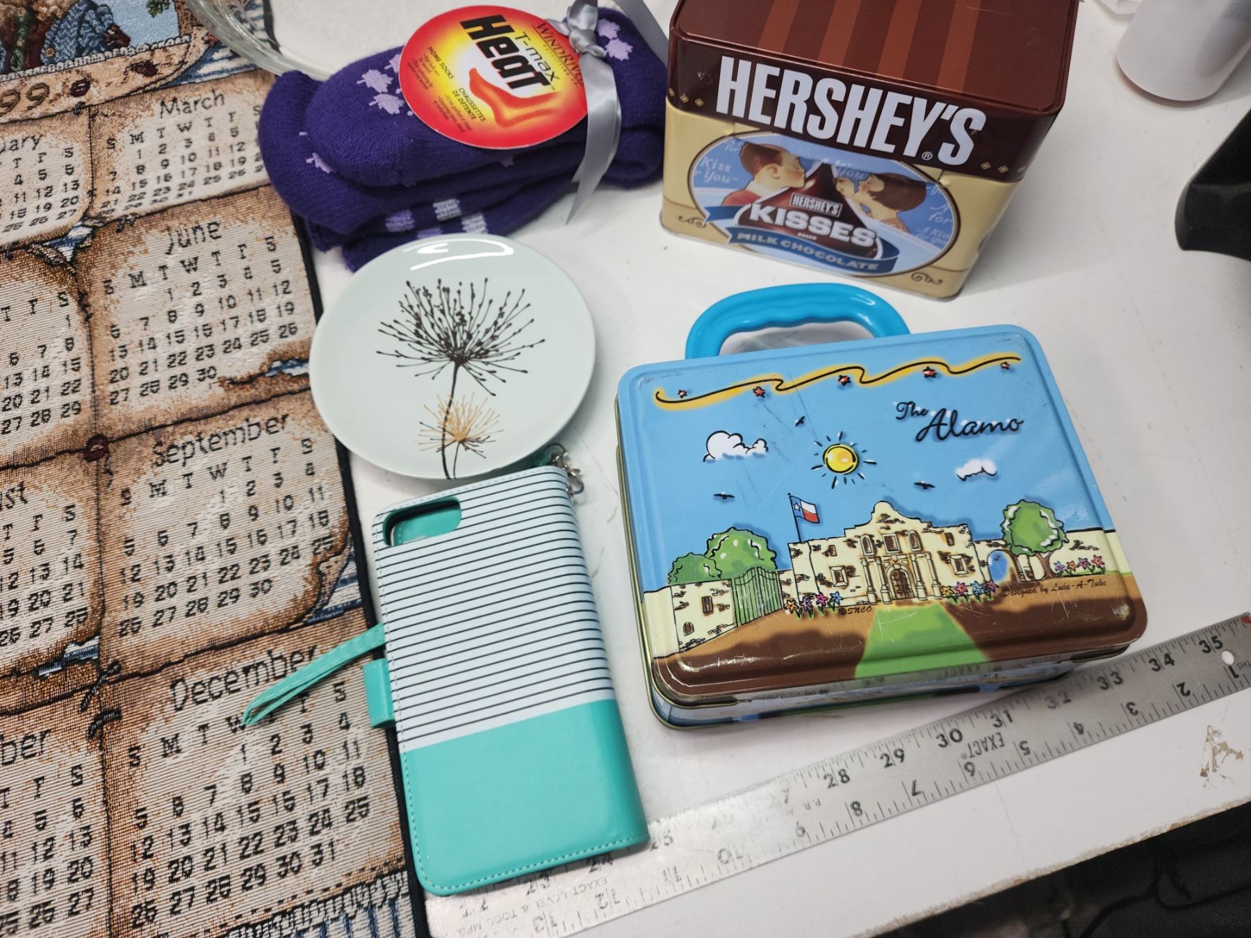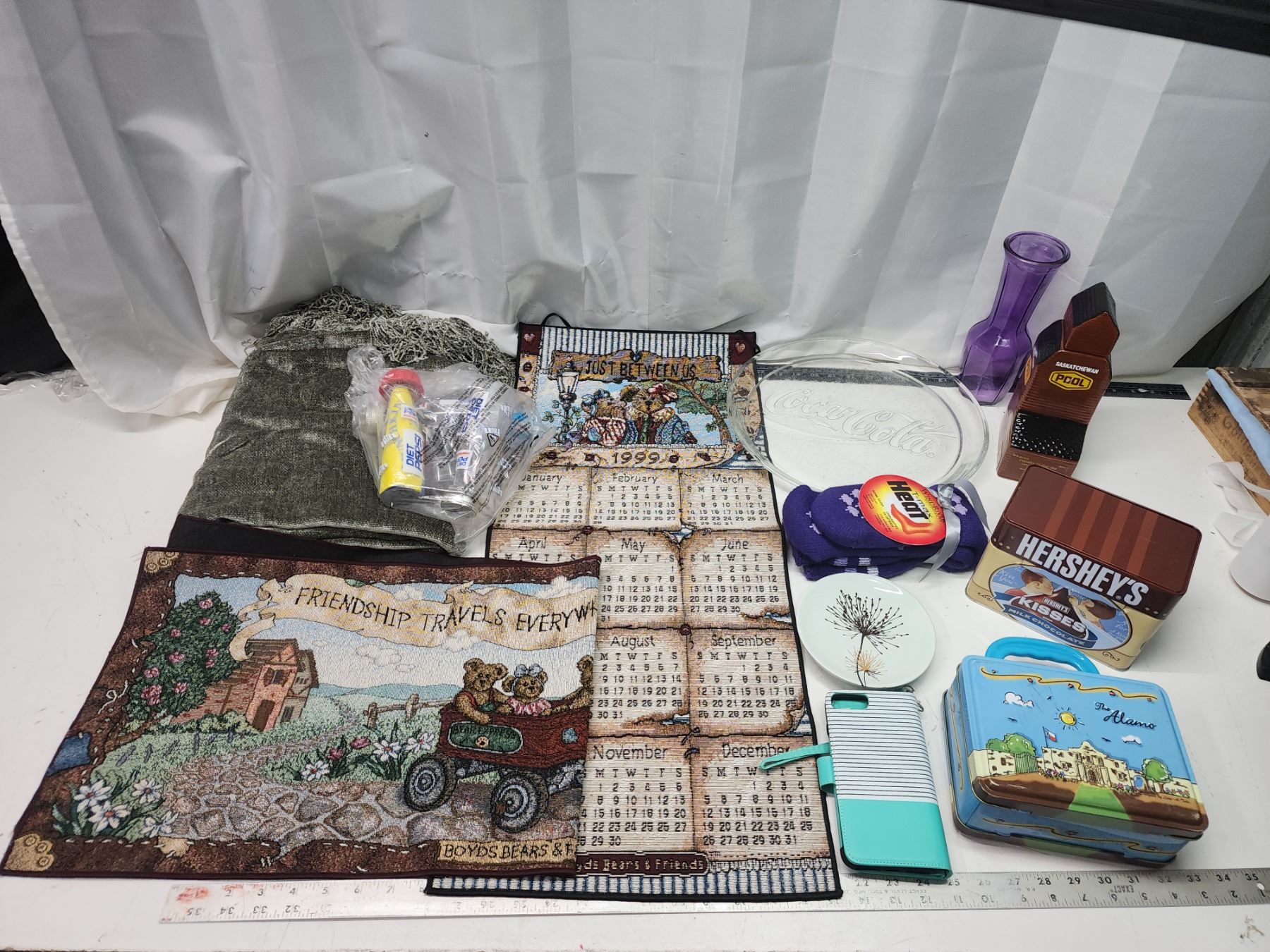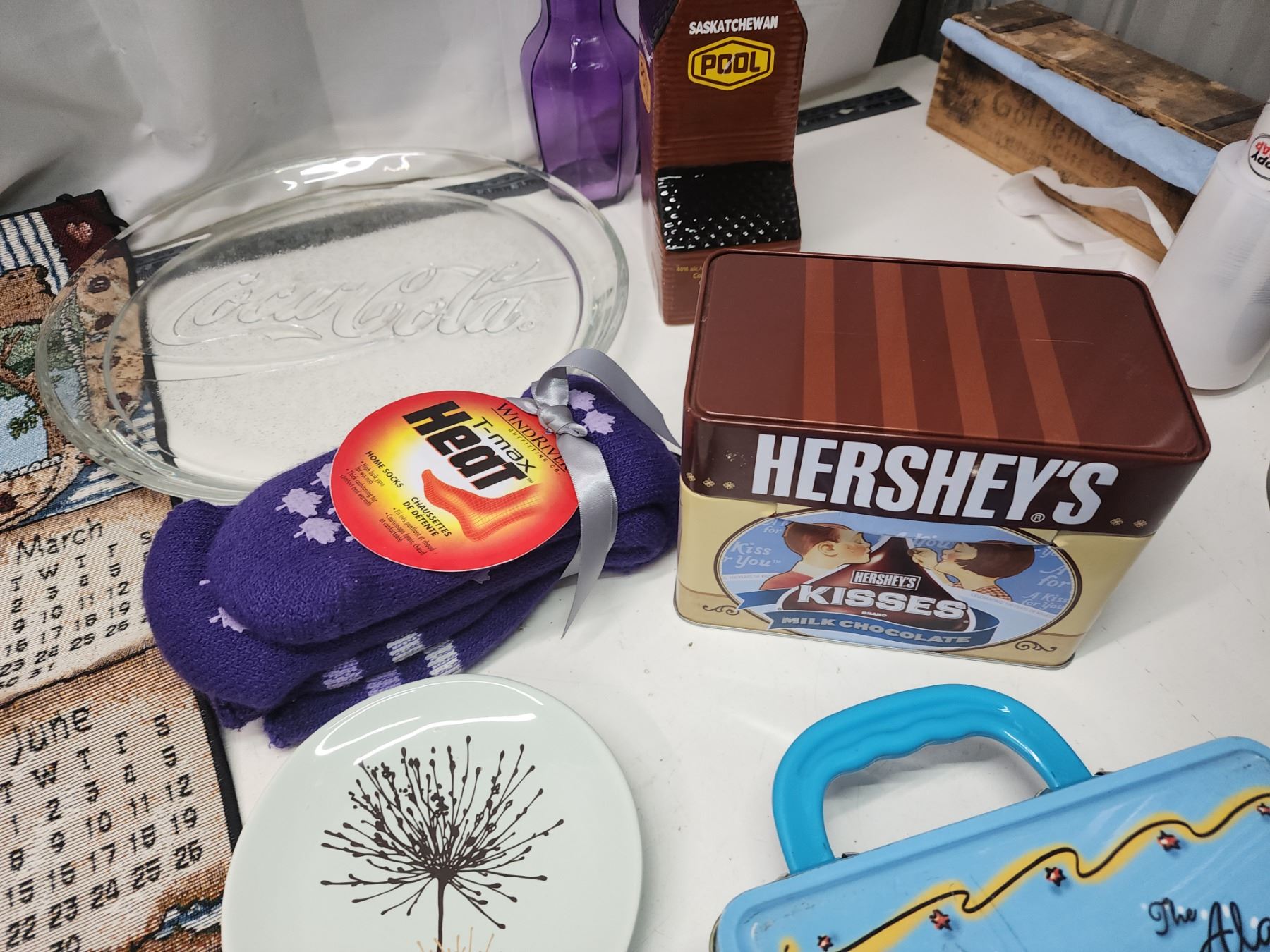 Bundle of assorted collectibles - tins, calender, coca-cola tray, etc.