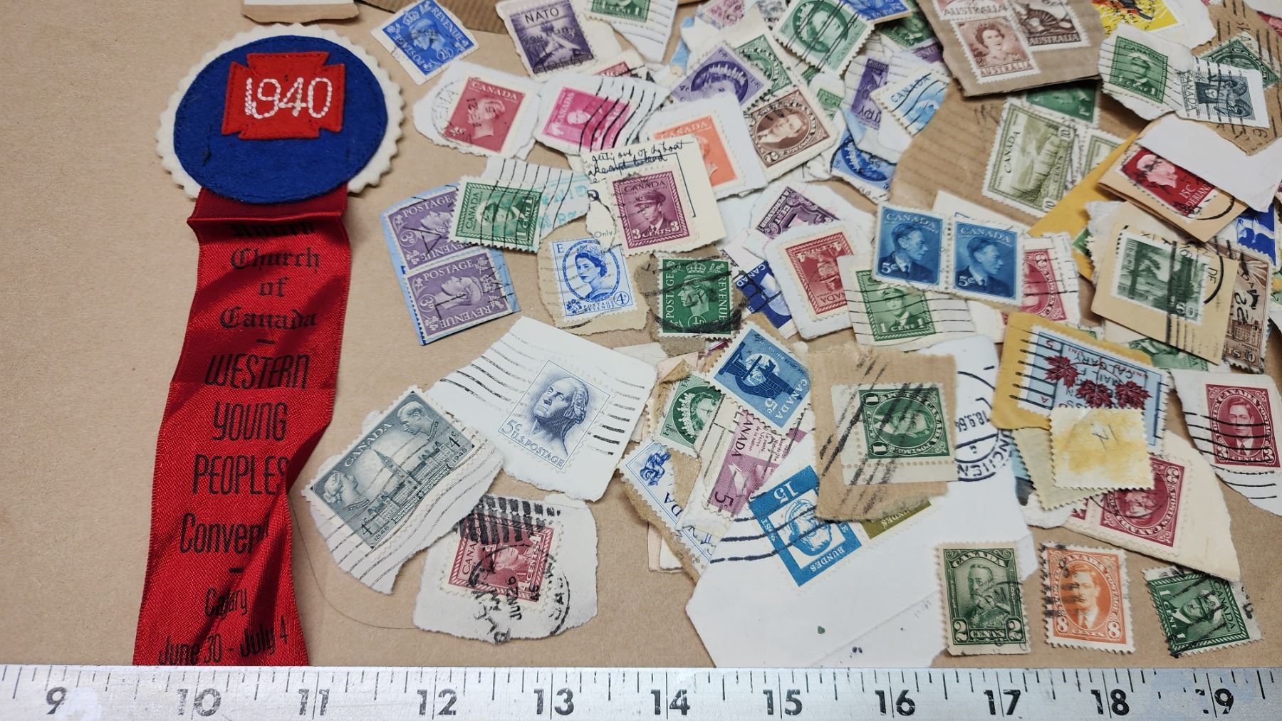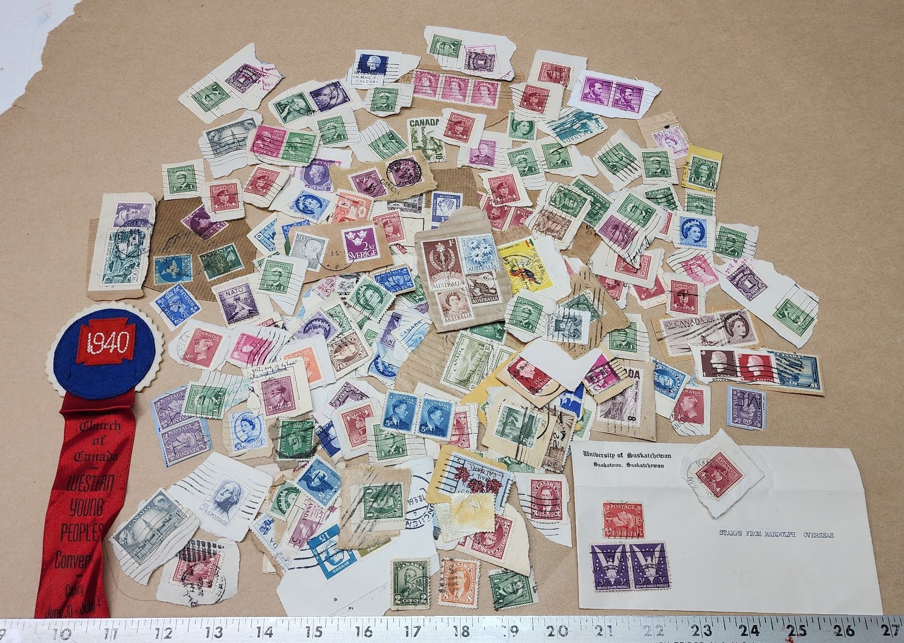 Bundle of assorted stamps - used, over 100 & 1940s ribbon