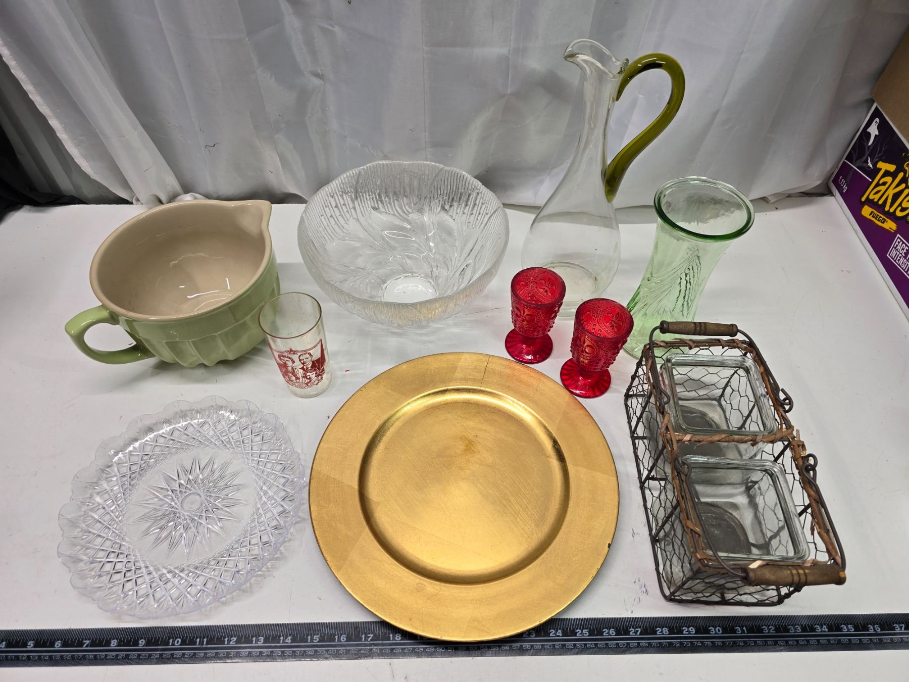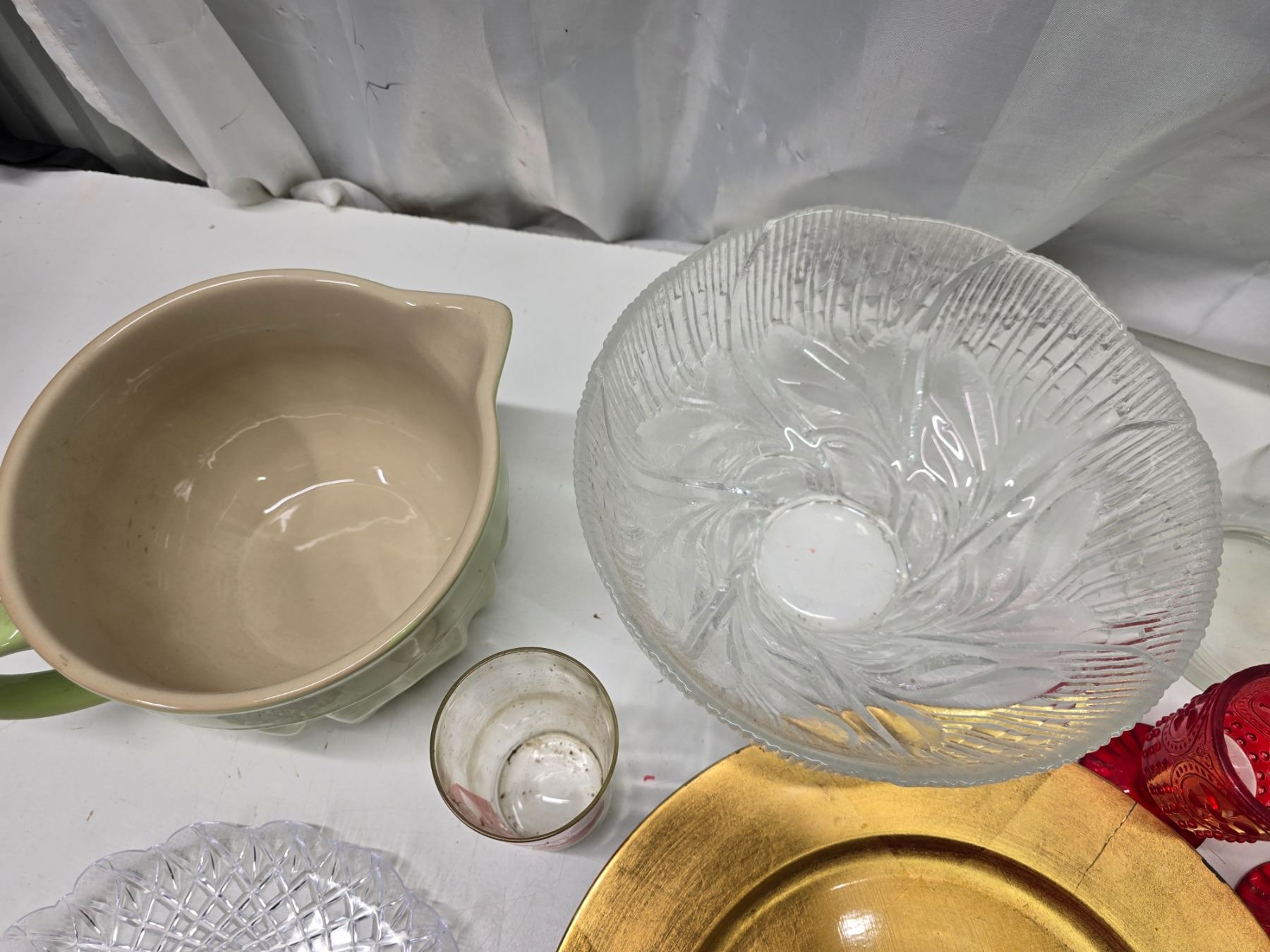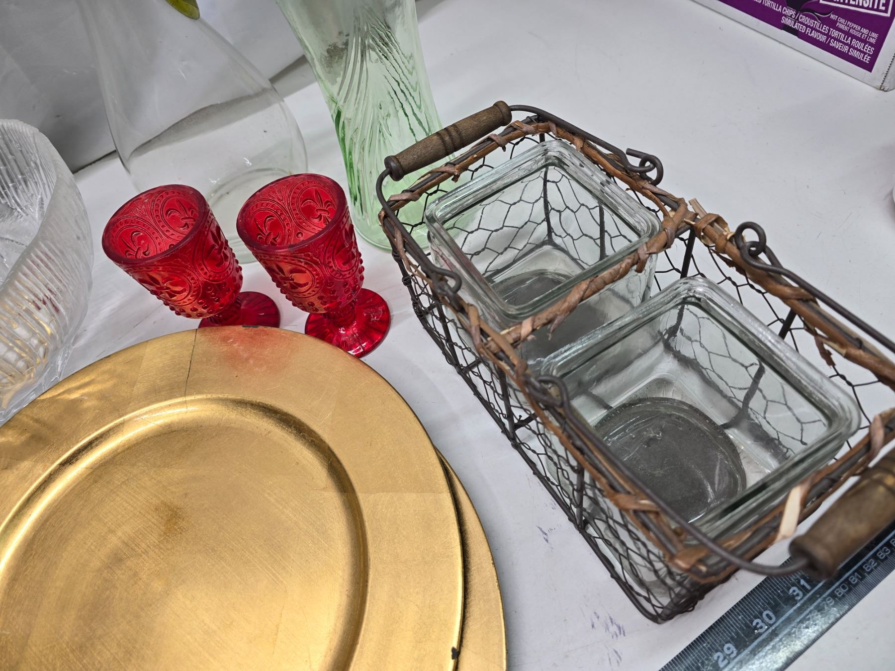 Bundle of household items - Platters, bowls, vases, large glass pitcher, red glass goblets, etc.
