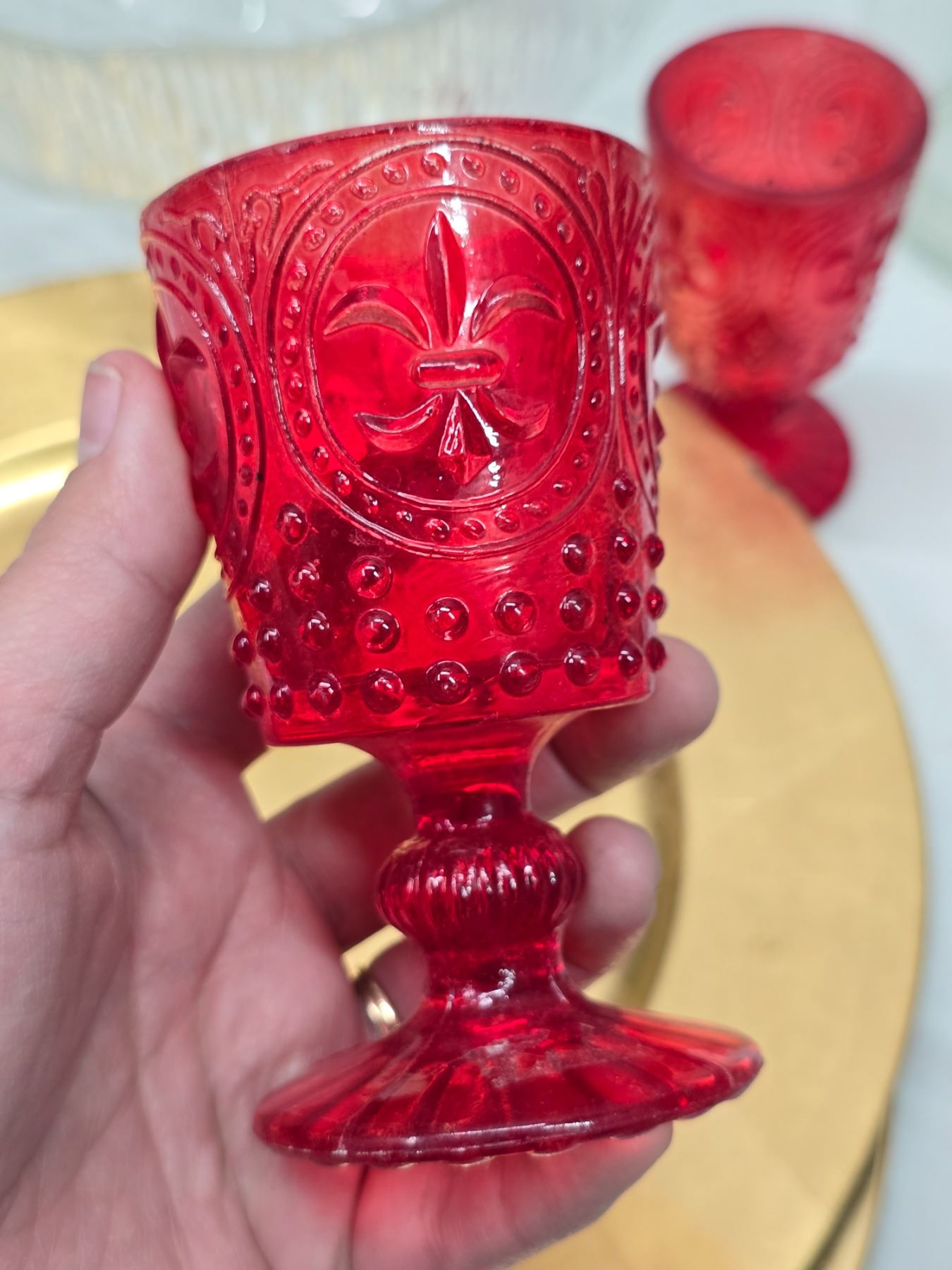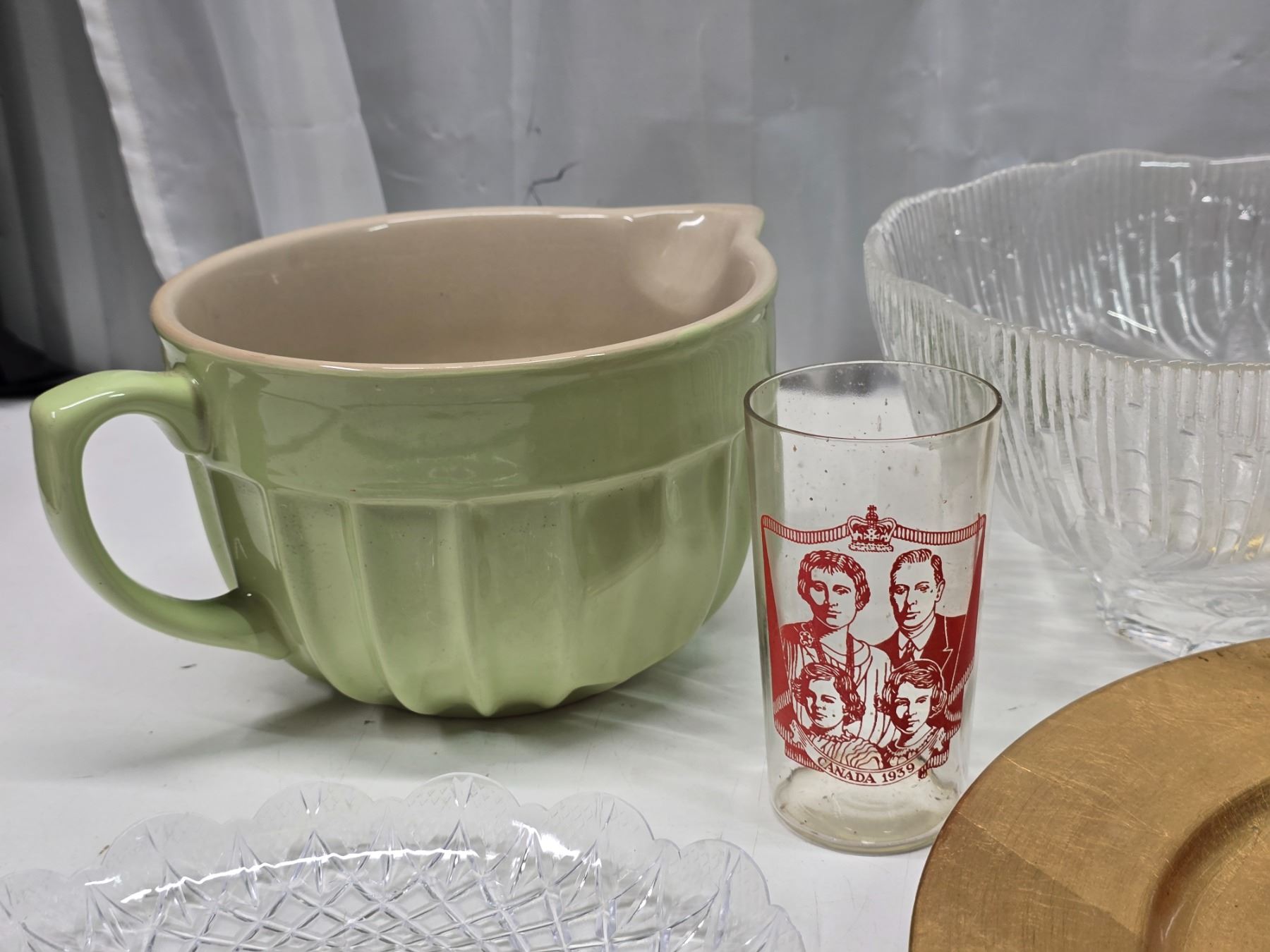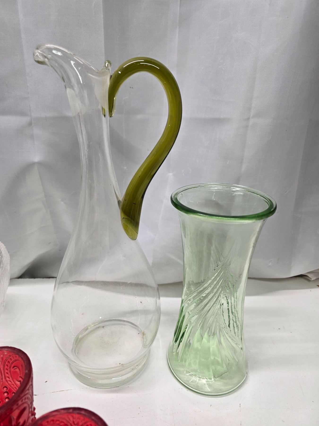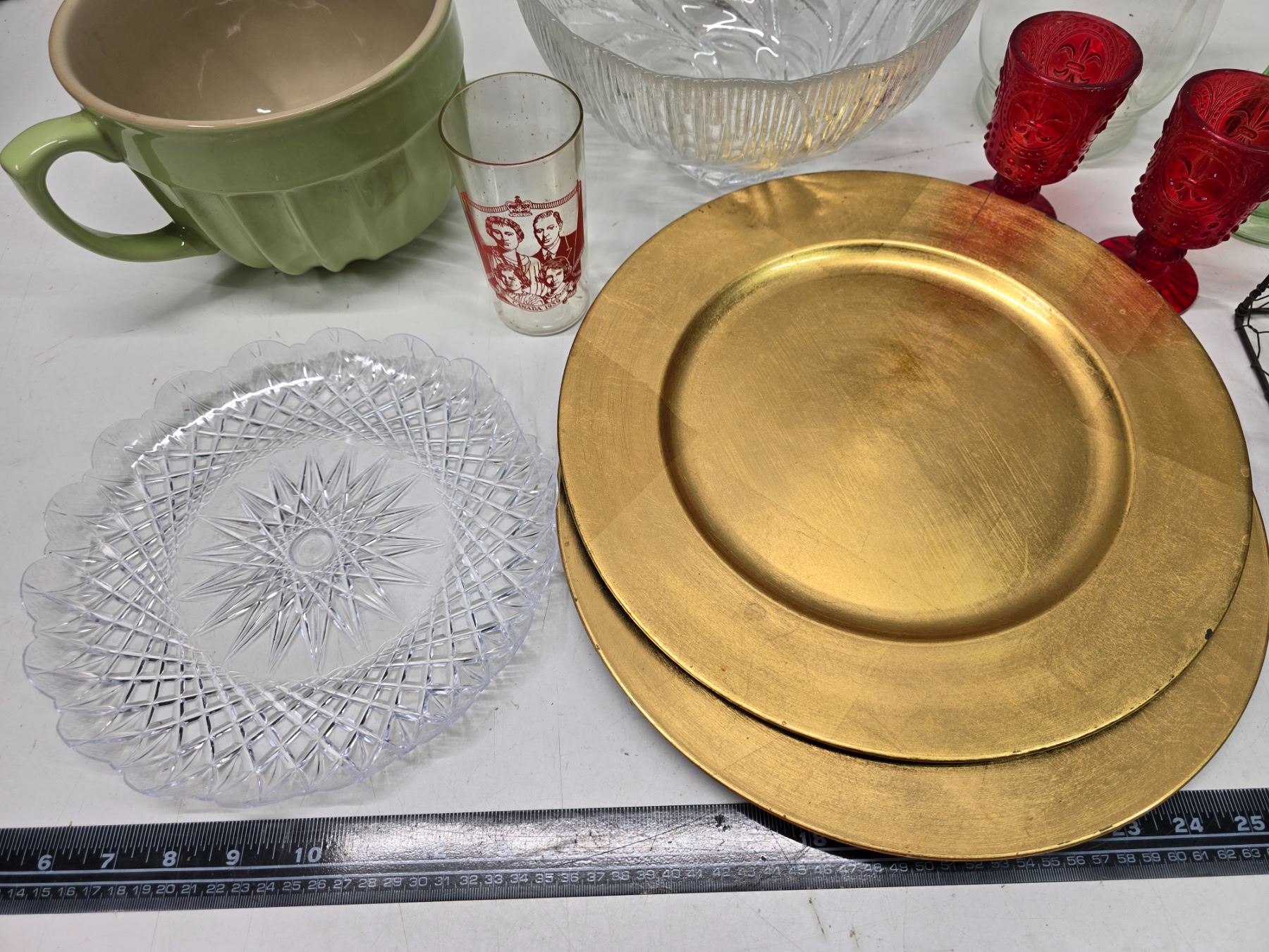 Bundle of household items - Platters, bowls, vases, large glass pitcher, red glass goblets, etc.