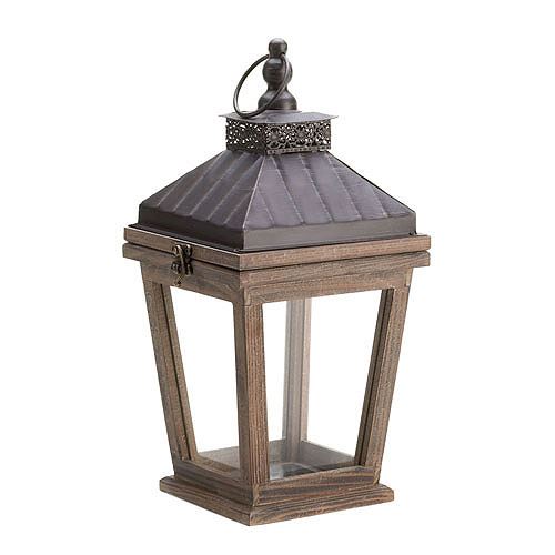 Bungalow Candle Lantern **|**|** Showcase your favorite candle with this stunning Bungalow Candle Lantern. The four clear glass panels let the light shine bright and the beautifully detailed frame creates plenty of visual interest. Hang it from the top loop or rest it on its base. Item Weight: 1.8 lbs. 7 x 7" x 14-1/2" high. Wood, glass and iron. 1 EA"