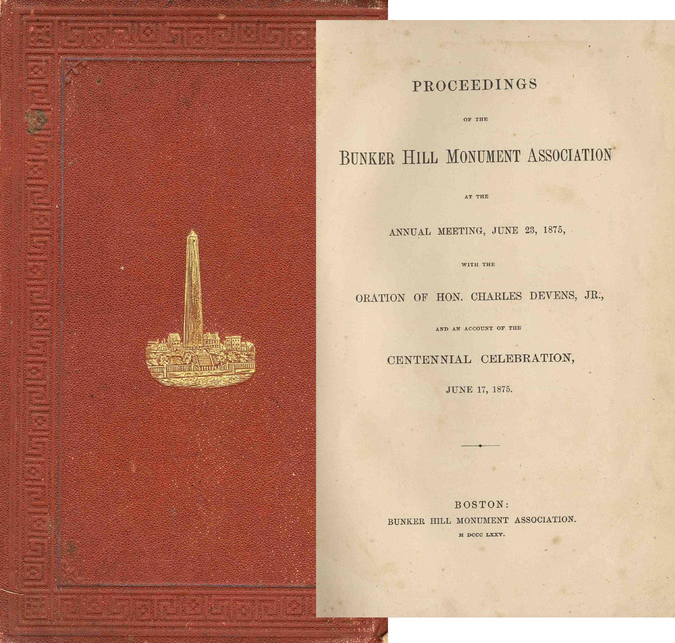 ''Proceedings of the Bunker Hill Monument Association at the Annual Meeting, June 23, 1875, with the Oration of Hon. Charles Devens, Jr., and an Account of the Centennial Celebration, June 17 1875.'' Boston: Bunker Hill Monument Association: 1875. Hardcover octavo runs 216pp. Some wear and soiling to boards and backstrip. Some separation to top and tail of joints. Previous owner's ink signature to front flyleaves. Separation at hinge, spine broken in center. Overall in very good condition.
