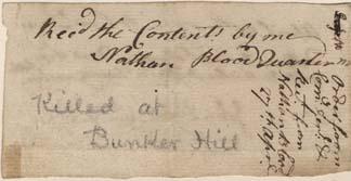 Autograph document signed by Nathan Blood who died at Bunker Hill only days after writing this army requisition order. Document dated 24 April 1775 written by Blood: ''Read the contents by me Nathan Blood. order from Concord Lexington Rec'd from Nathan Blood, 27th April.'' On the verso reads in another hand ''to Comm. Davis. Deliver to Capt. Reuben Dow, six pots and twelve dishes and twenty wooden bottles. John Pigeon.'' 4'' x 2'' document tipped to larger sheet with a picture of a memorial.