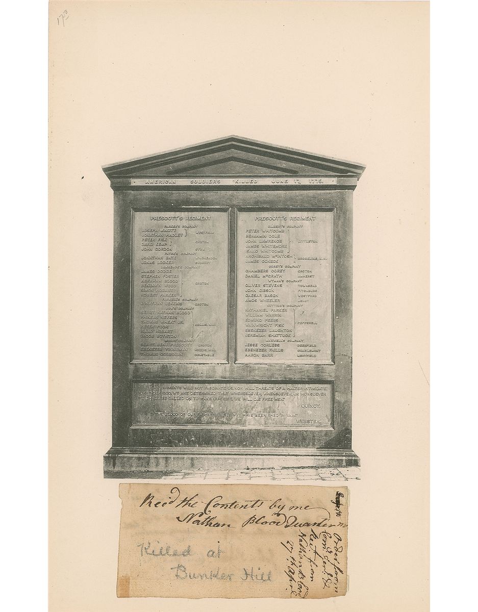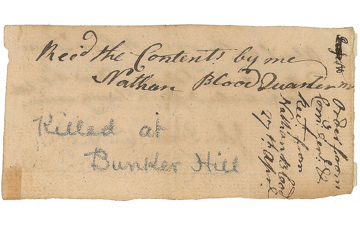 Soldier killed during the Battle of Bunker Hill on June 17, 1775. Rare Revolutionary War–dated handwritten endorsement, “Rec’d the Contents by me, Nathan Blood Quarter M,” on the reverse of a manuscript order for supplies signed by John Pigeon, one page, 4 x 2, April 25, 1775. Pigeon’s order, submitted to Com. Davis, in full: “Deliver to Capt. Reuben Dow, six pots & twelve Dishes & Twenty wooden bottles.” A contemporary docketing notation is penned below Blood’s signature to indicate receipt, also bearing a later pencil collector’s notation. Affixed at the left edge to a 6.75 x 10.75 image of a memorial. In very good condition, with scattered toning and soiling, and a toned tape remnant to the lower left corner. An exceedingly rare piece from within days of the Battles of Lexington and Concord, signed by one of the earliest American casualties.