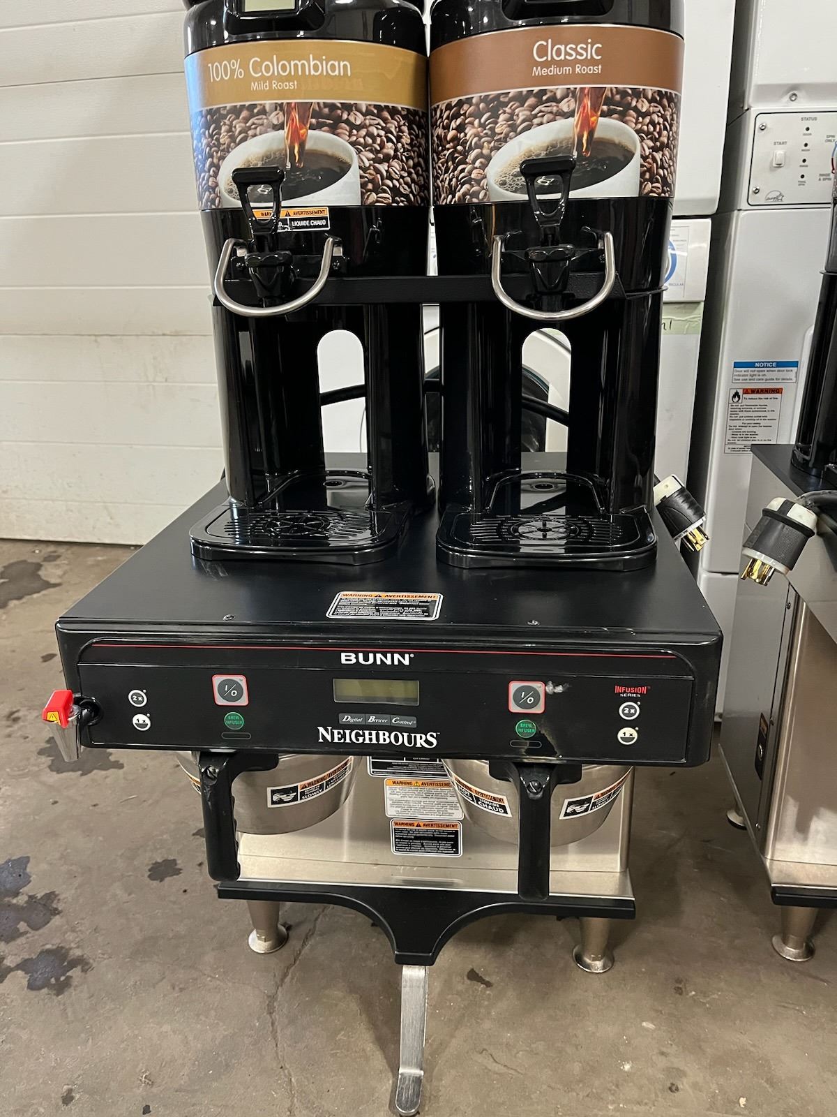Bunn Coffee Machine w/ 2 Coffee Urns in good working condition, note the red hot water handle in broken but still works...used