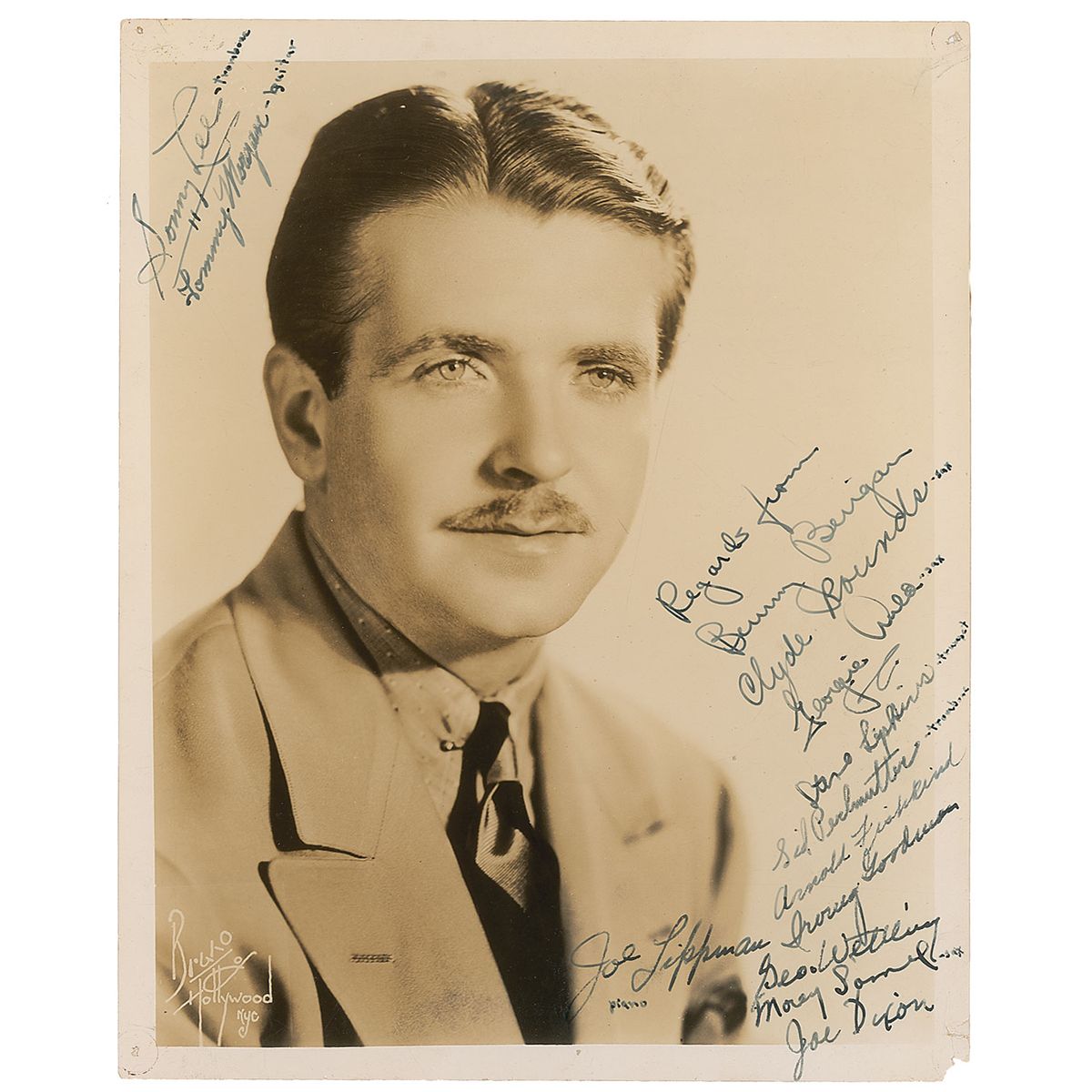 Jazz trumpeter (1908–1942) who rose to stardom during the swing era, but was hampered by alcoholism until it drove him to death at age 33. Vintage glossy 8 x 10 photo of Berigan, signed in fountain pen, “Regards from Bunny Berigan,” and also signed by his 12 band members including: Clyde Rounds, Georgie Auld, Steve Lipkins, Sid Perlmutter, Arnold Fishkind, Irving Goodman, George Wettling, Joe Dixon, Joe Lippman, Sonny Lee, and Tommy Morgan. Reverse bears collector’s notations stating the signatures were obtained at the Hotel Pennsylvania on June 29, 1937. In fine condition, with a single tack hole to each corner tip, slight paper loss to lower right corner tip, and a mild impression of a label affixed to reverse.