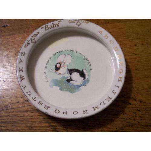 A darling baby dish with a rabbit on it .Has a signiture below rabbit but I can not read it.Minor wear to gold.No mark on the bottom of this one. Measures 7 1/2" across top.No chips or cracks.Some minor scratches on decal.