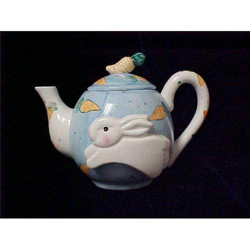 Bunny Teapot with Carrots ? Adorable teapot has a raised bunny on the front and cheerful carrots throughout. The maker is unknown and the pot is in very good condition.