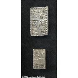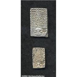 <B>Bunsei Isshu Gin and Nishu Gin as follows:</B></I> Isshu Gin ND (1829-37), KM-C11, VF/XF; and a Nishu Gin ND (1824-30), KM-C13a, VF+ with a cut on the obverse. 2 coins <BR><BR><B>Important notice:</B> Heritage usually auctions material at the rate of 200-250 lots per hour. On some occasions eBay Live bid software or the Internet may not be able to keep up with the pace of the auction. We recommend placing a realistic absentee bid now as insurance to avoid disappointment. Occasionally the auctioneer may eliminate or reject an eBay Live bid, and the auctioneer may also reopen a lot after the close of the eBay live bidding (usually because we missed an audience bid), and may reject your bid even if it shows you as the winning bidder. By bidding via eBay Live, you agree that Heritage may award the lot to another bidder at its sole discretion under the circumstances described above or any other reasonable circumstances. Since eBay bids are not shown to us until we open the lot on the floor, we treat those bids just like floor bids. In most cases the floor responds before the eBay bid is presented to us, due to Internet lag time, so for consistency we have made it a policy that floor bids are always considered first over tie eBay live bids. Also please note that all Heritage lots purchased through eBay Live carry a 20% Buyer's Premium. Please make sure you read the Terms and Conditions before you bid.