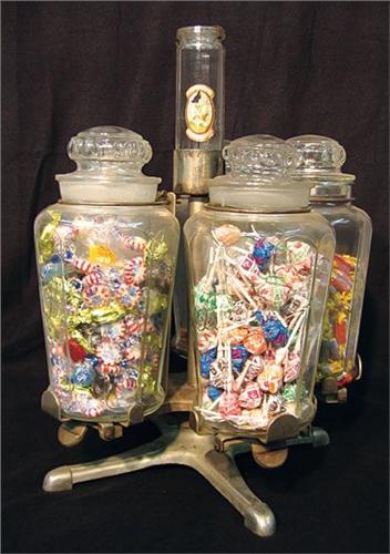 Bunte Candy Jar Carousel, Rare country store turntable swivel style, each Bunte jar is script with ground stopper, has rare upper center Bunte jar with label, each jar hinges over so children could reach in for candy. Cir. 1920.
