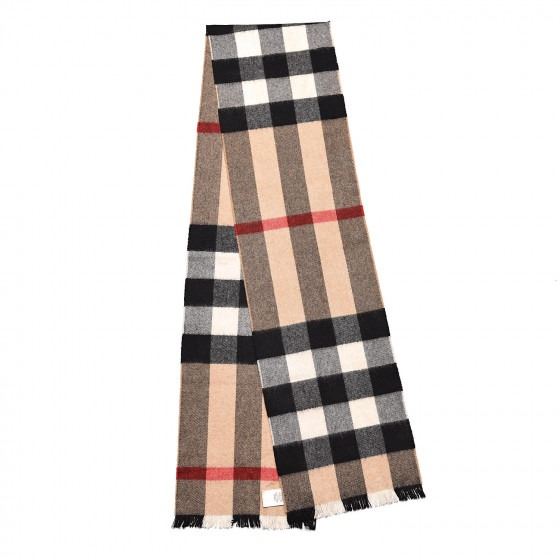 Camel scarf is crafted of 100% cashmere and features expanded traditional Burberry check pattern.