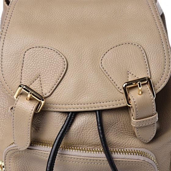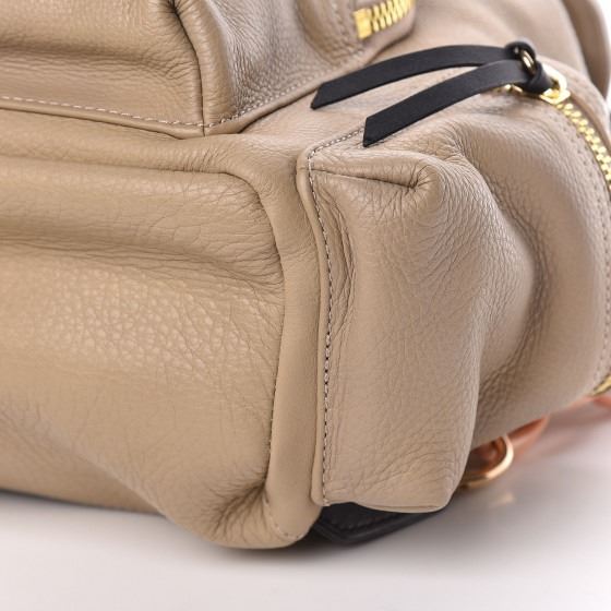 Backpack is crafted of deerskin leather in beige, with black calfskin leather trim, and gold hardware accents. The bag features a rolled leather top handle, adjustable black canvas and peach pink resin chain link shoulder straps, a front zipper pocket, and two side zipper pockets. The crossover flap and top cinch cord open the bag to a black Burberry logo fabric interior with zipper and patch pockets.