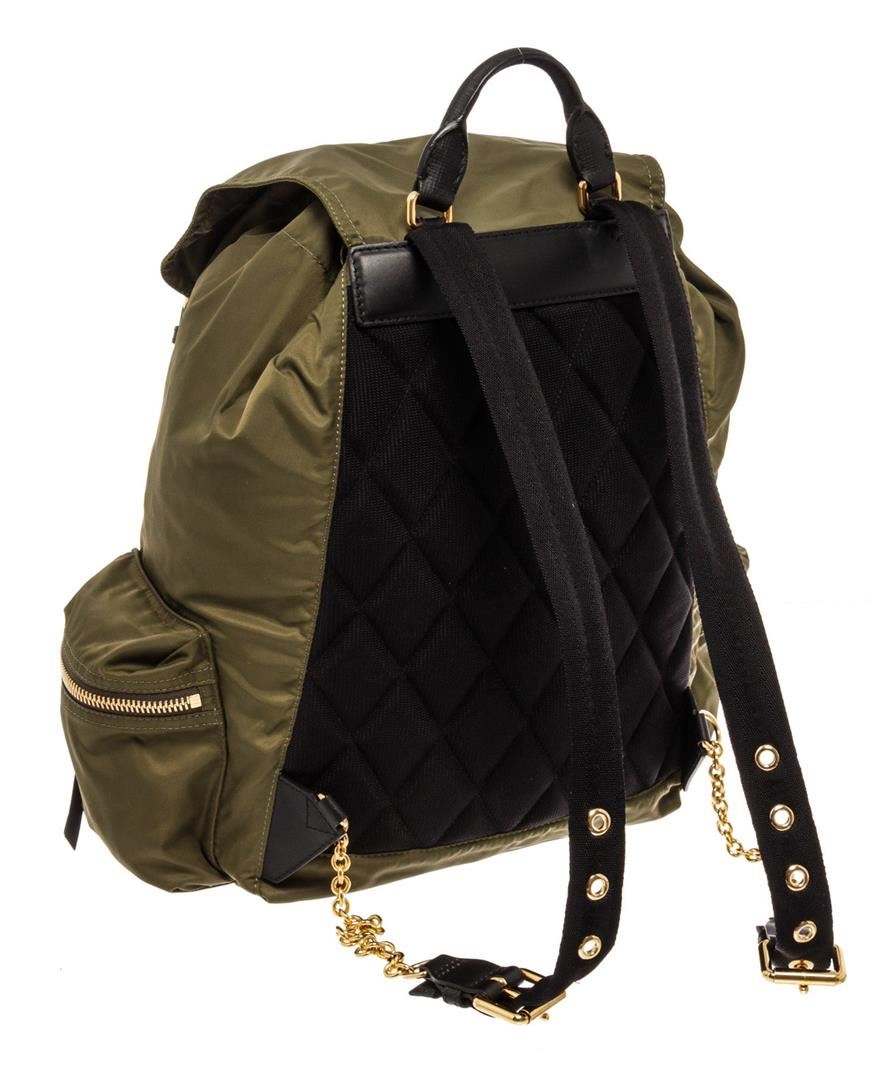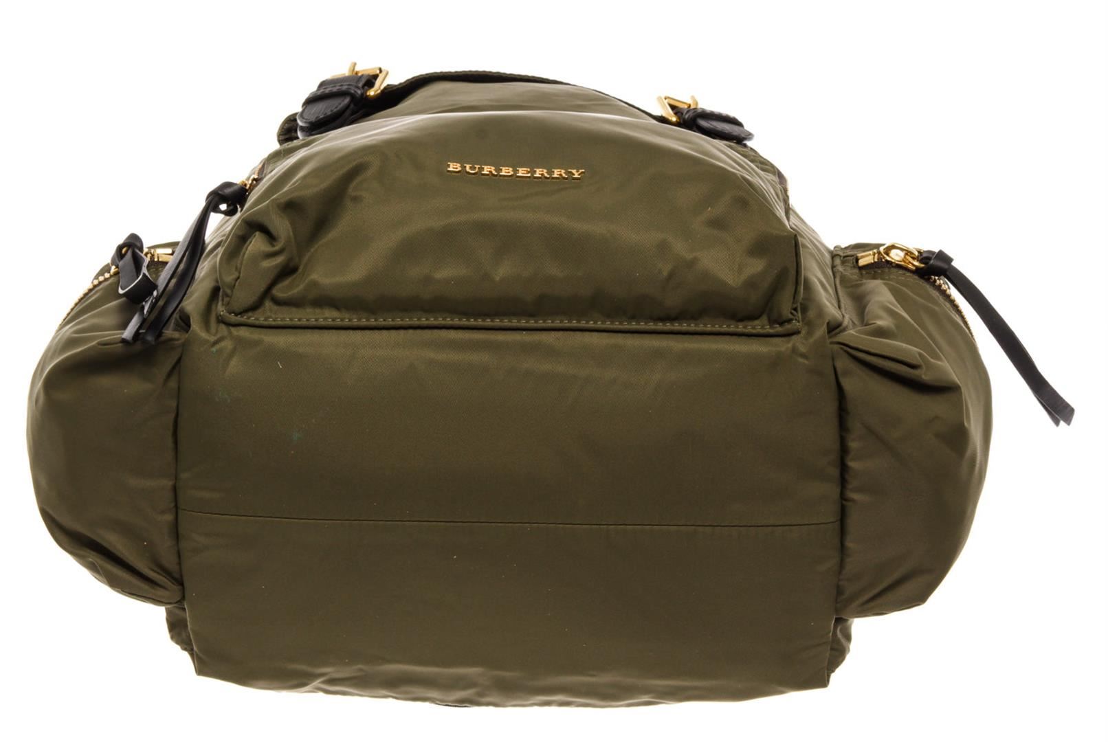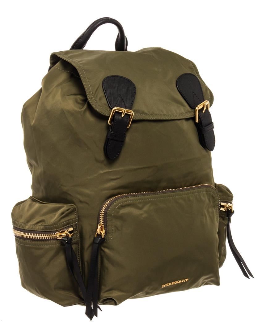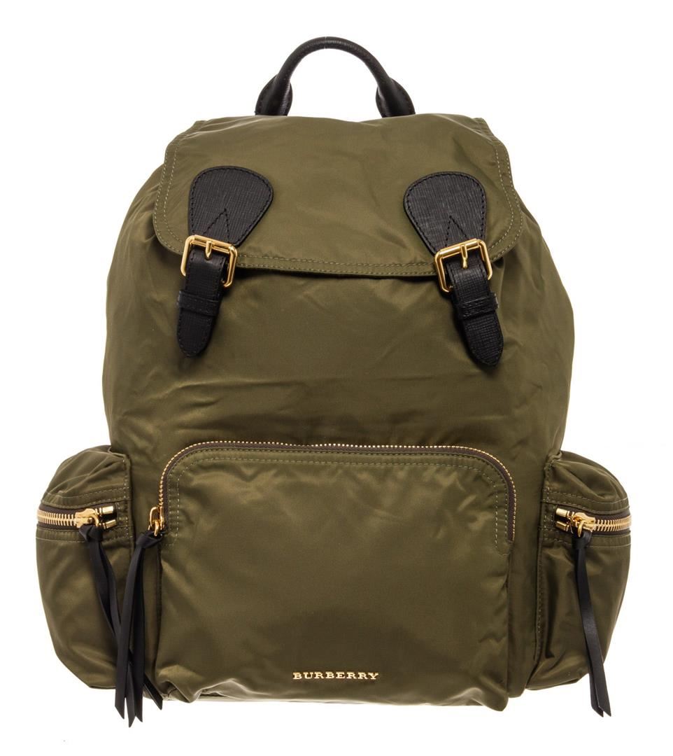 Burberry large backpack featured green nylon, gold-tone hardware, black canvas adjustable backpack straps and leather top handle, cinch closure with flap top with two buckle closures, three exterior zip pockets and black fine textile lining with one zip p