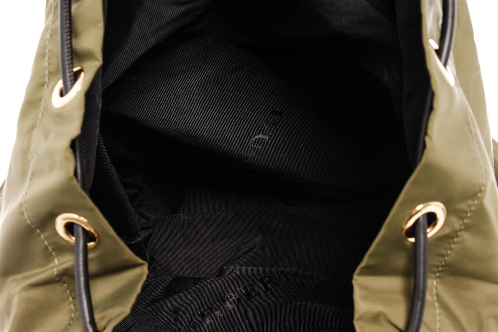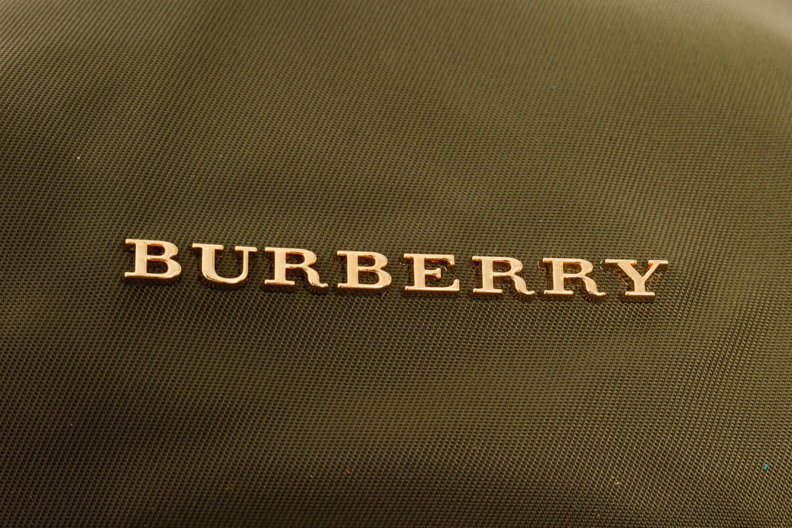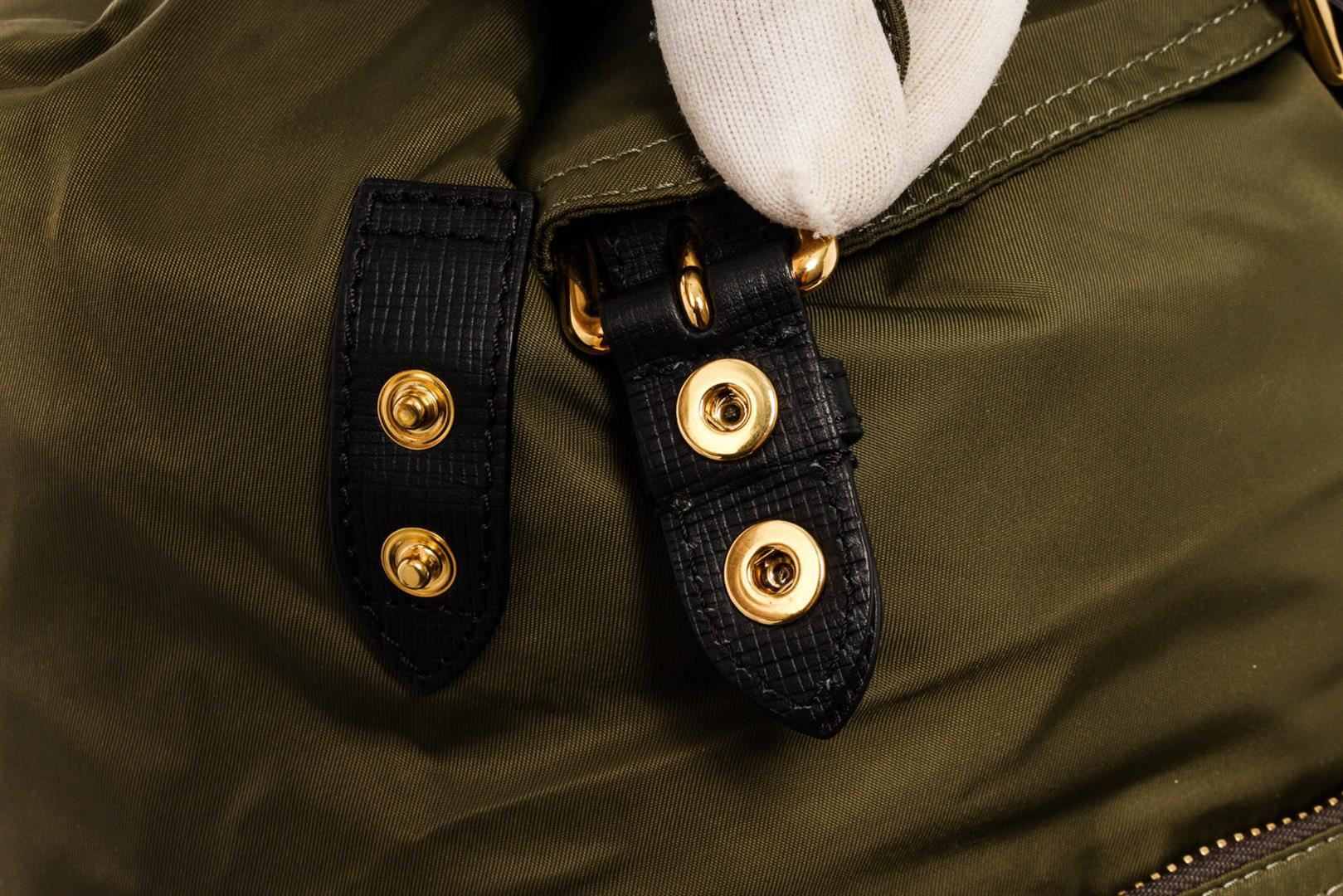 Burberry large backpack featured green nylon, gold-tone hardware, black canvas adjustable backpack straps and leather top handle, cinch closure with flap top with two buckle closures, three exterior zip pockets and black fine textile lining with one zip p