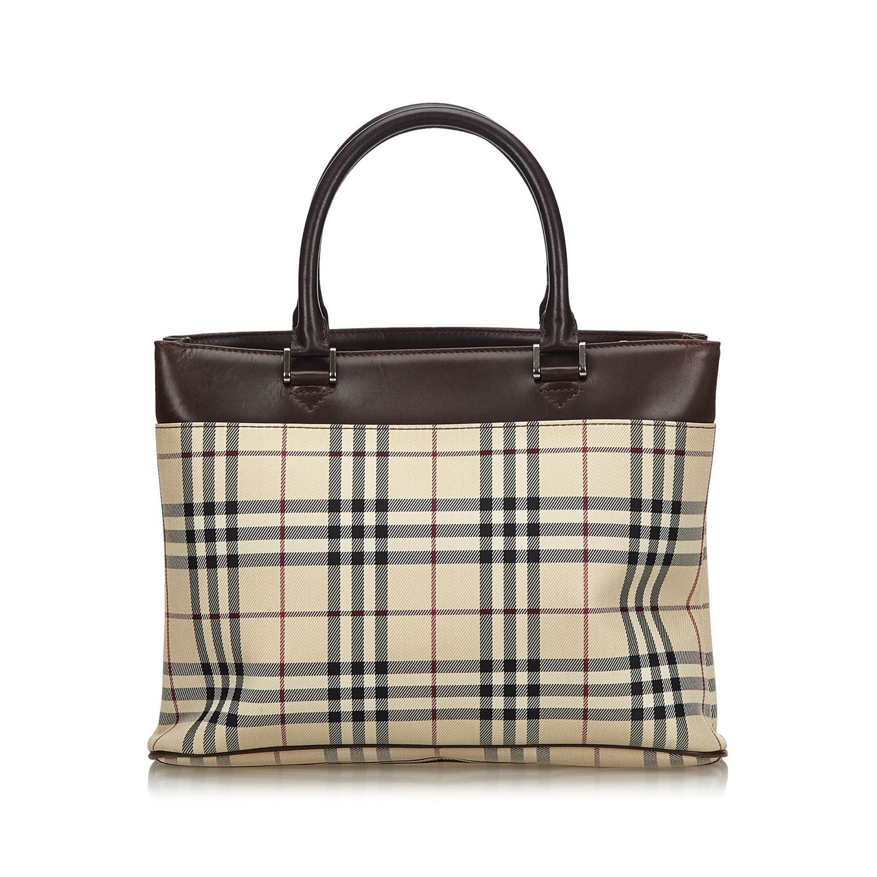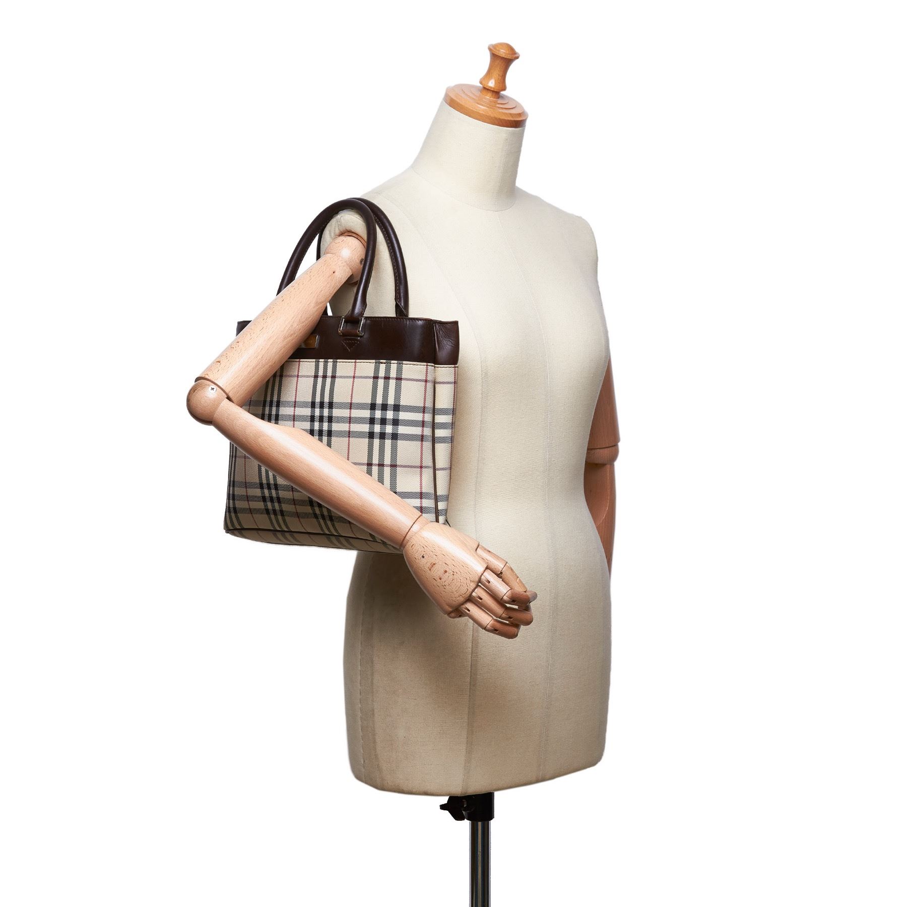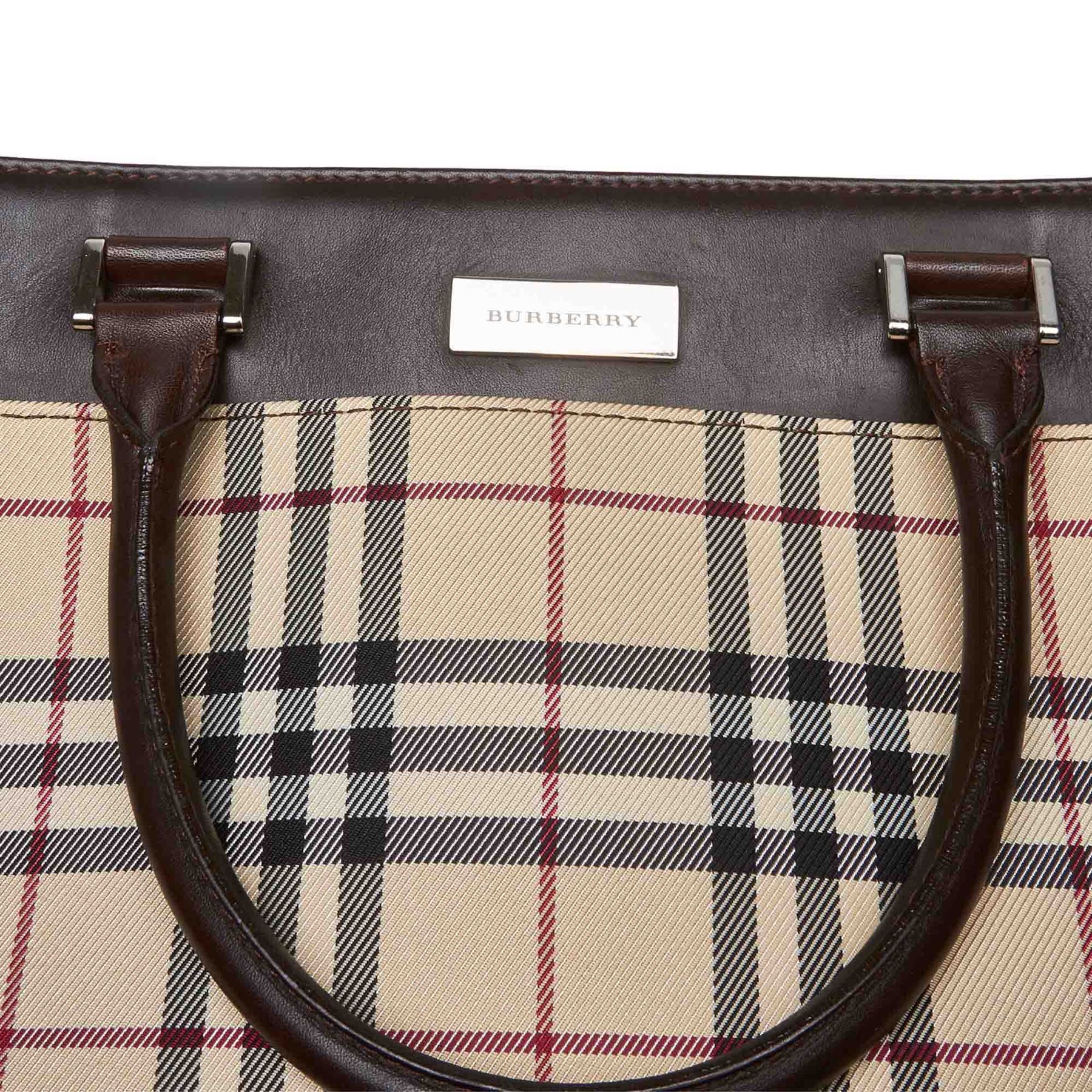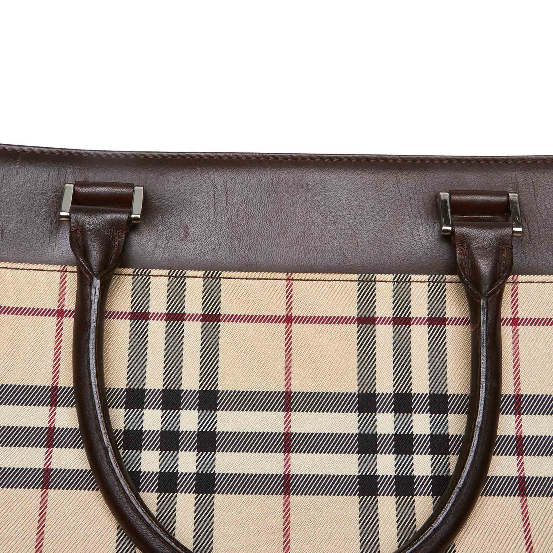 This handbag features a canvas body with leather trim, rolled leather handles, an open top, and interior zip and slip pockets. Fabric x Canvas x Leather x Others Brown x Beige x Multi Exterior back is scratched. Exterior corners is loose stitching. Exterior front is loose stitching, out of shape and scratched. Size: 24 x 33 x 8 Card: NO Made in: United Kingdom
