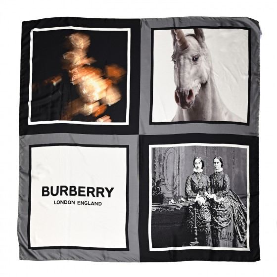 Monochrome scarf is crafted of 100% silk and features four different images: a white unicorn, blurred roses, a Victorian portrait of two women, and a prominent Burberry logo.