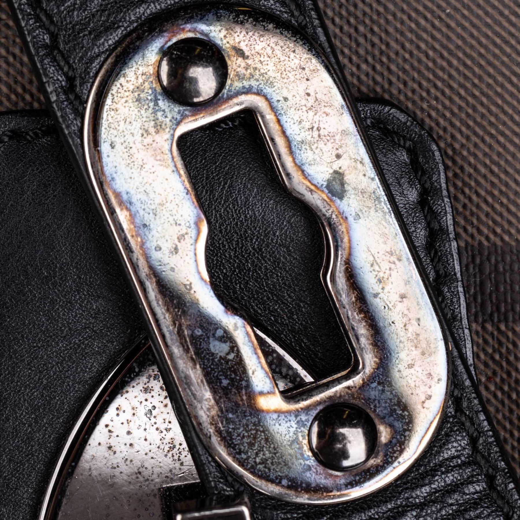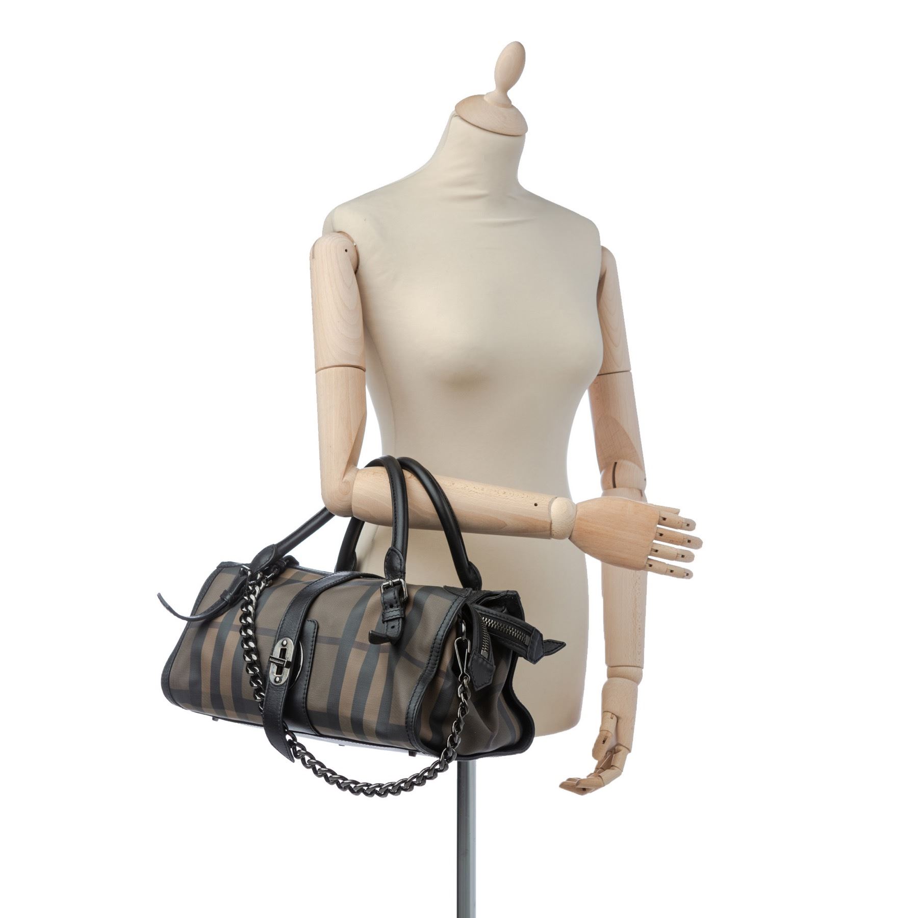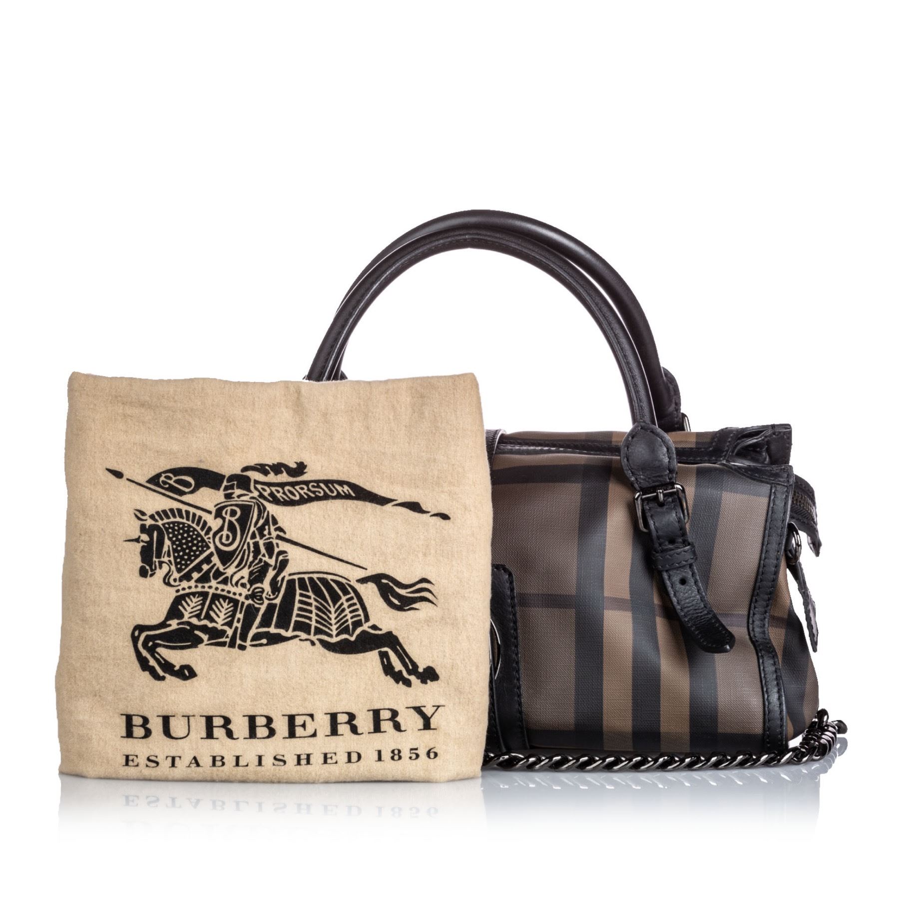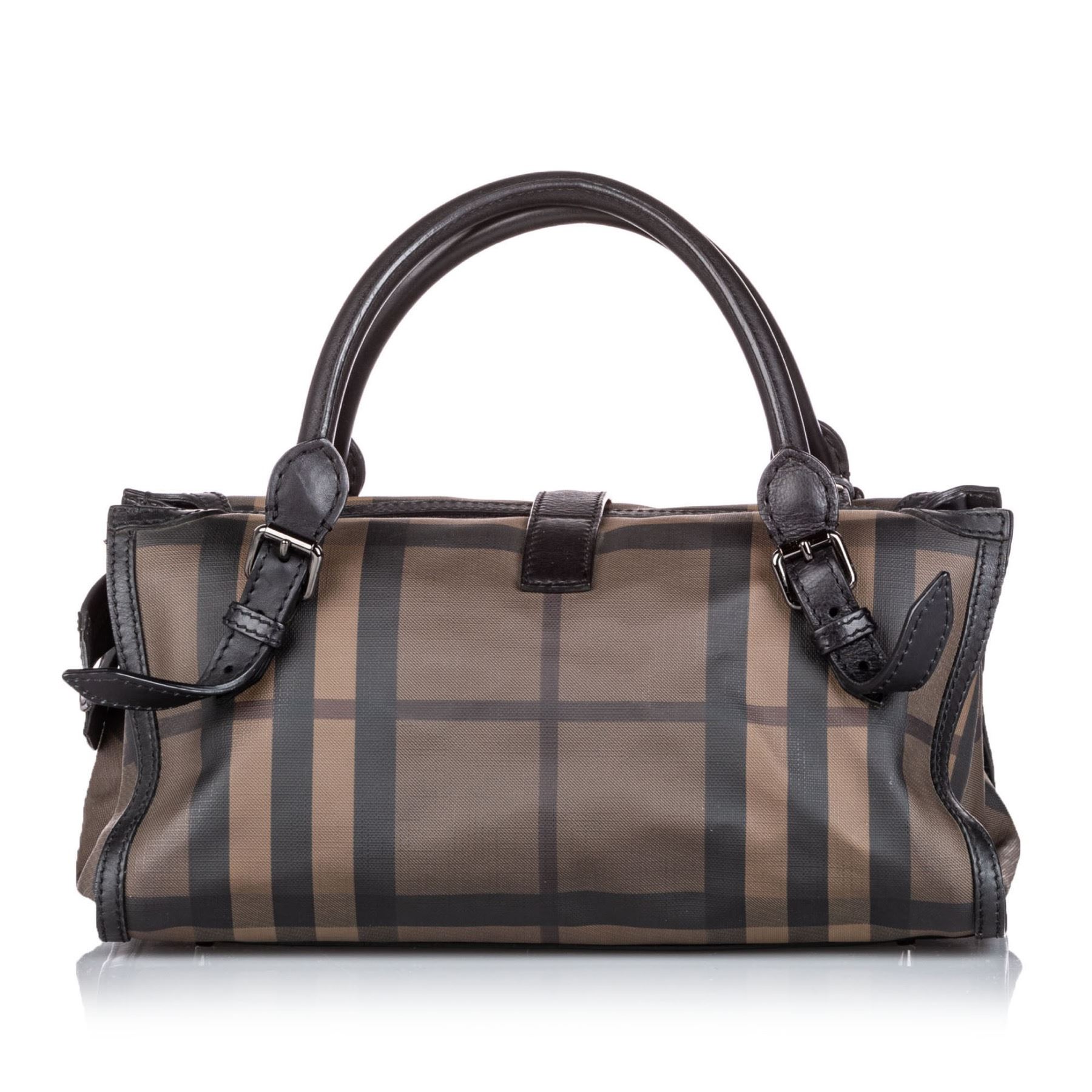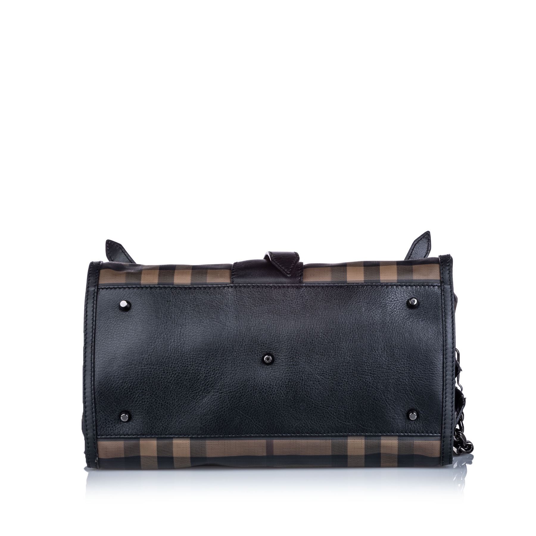 This handbag features a PVC body, rolled leather handles, a chain detail, a top zip closure with flat strap and turn lock closure, and an interior zip pocket. Plastic x PVC x Leather x Others Brown x Dark Brown Exterior front is scratched. Exterior back is scratched. Exterior side is scratched. Buckle is damaged and tarnished. Size: 25 x 35 x 15 Card: NO Made in: United Kingdom
