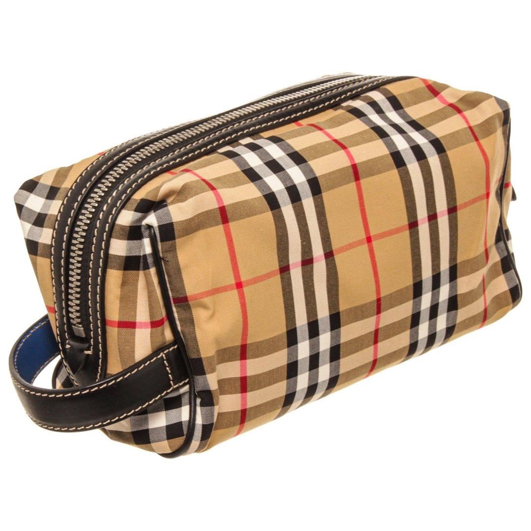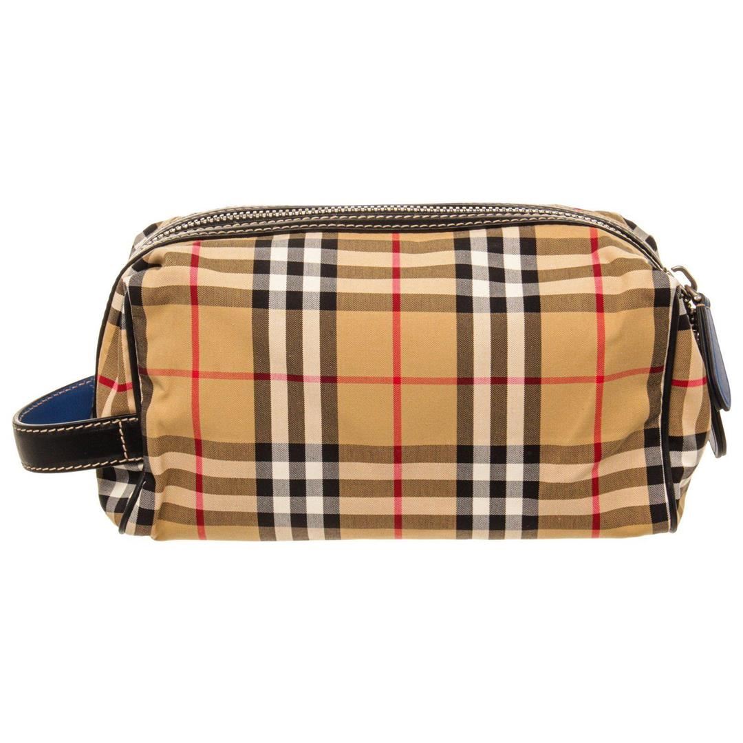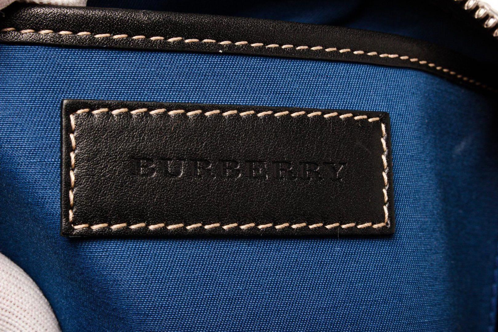 Burberry Tan Patent Leather Cosmetic Pouch with patent leather trim, silver-tone hardware, interior zip pocket, front exterior flap pocket with snap closure, zip top closure, adjustable patent leather shoulder strap.