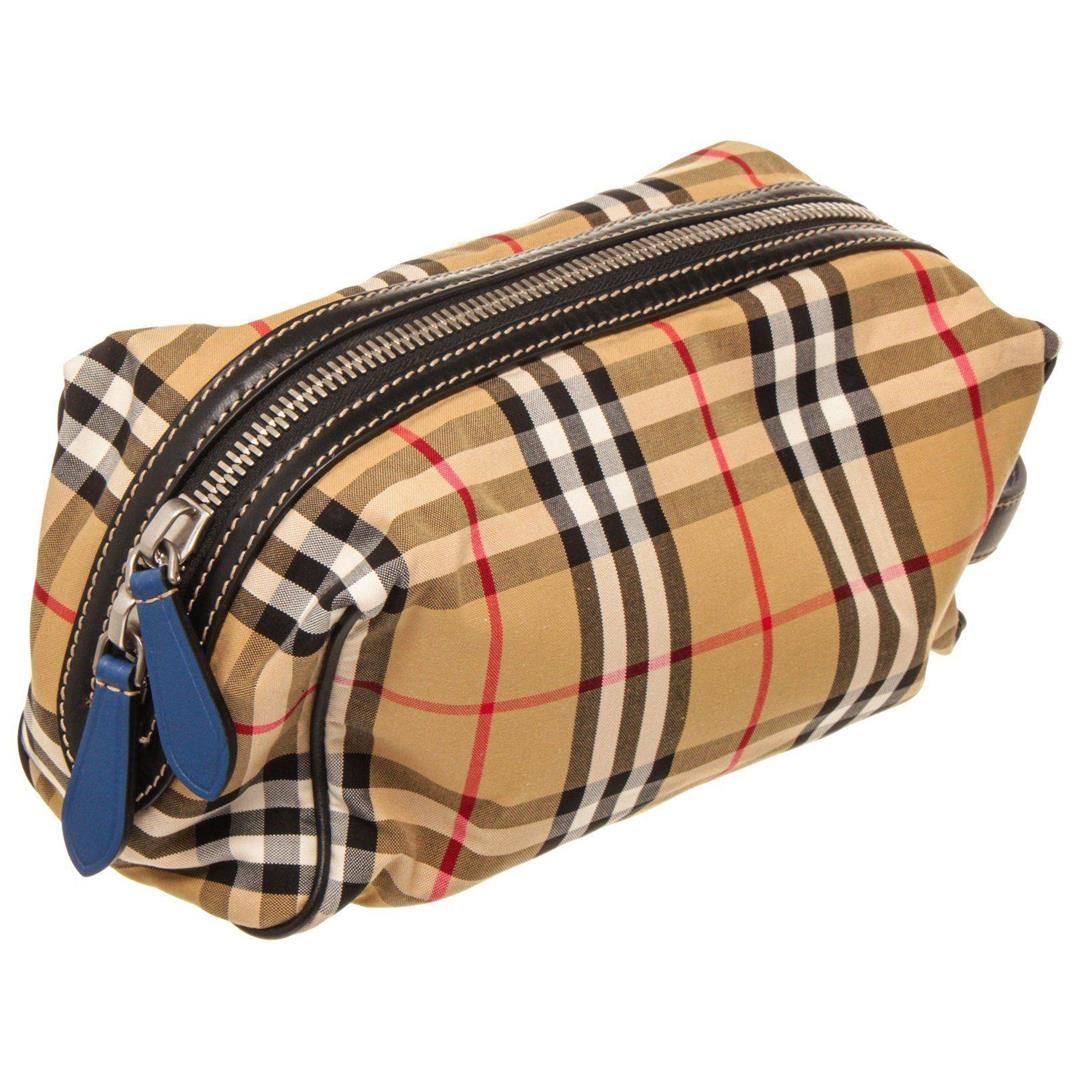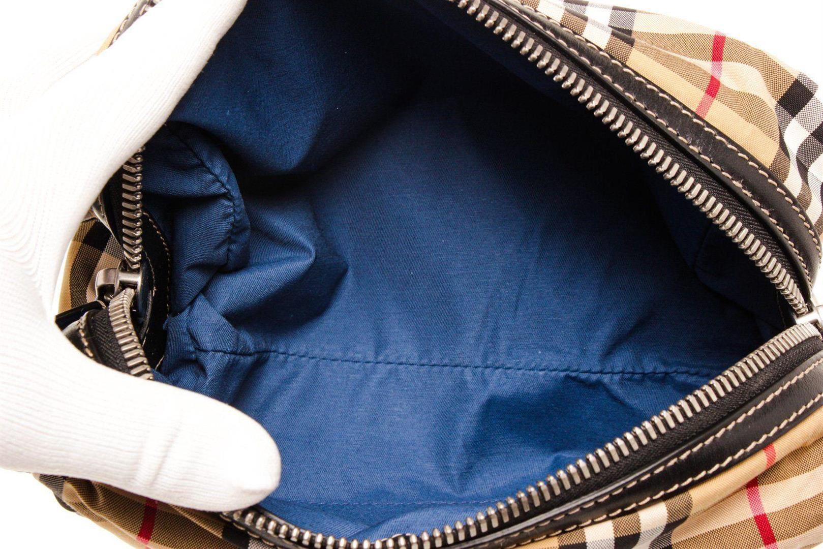 Burberry Tan Patent Leather Cosmetic Pouch with patent leather trim, silver-tone hardware, interior zip pocket, front exterior flap pocket with snap closure, zip top closure, adjustable patent leather shoulder strap.